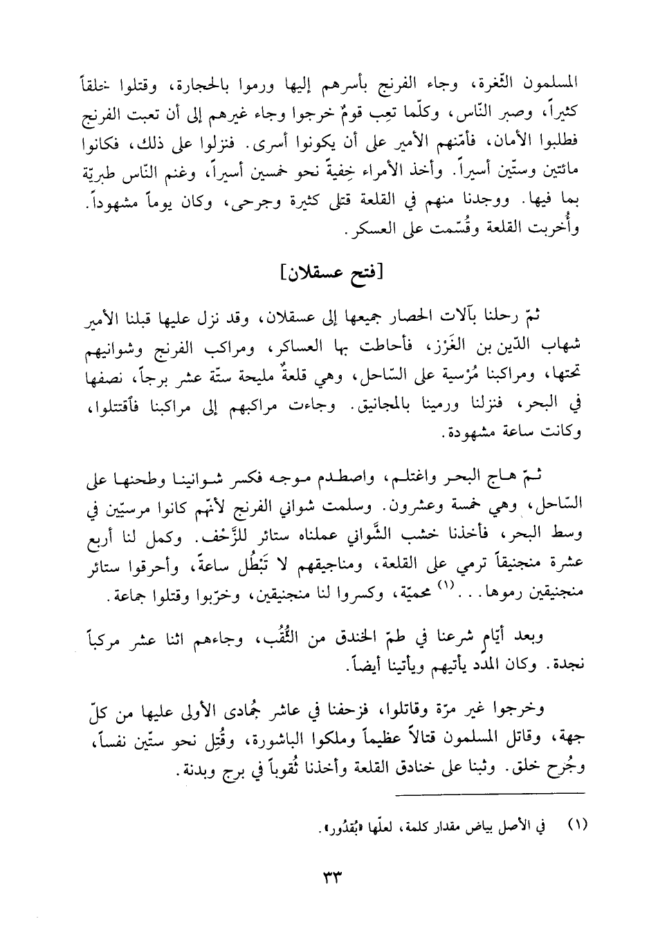 ثمّ رحلنا بآلات الحصار جميعها إلى عسقلان، وقد نزل عليها قبلنا الأمير شهاب الدّين بْن الغَرْز، فأحاطت بِهَا العساكر، ومراكب الفرنج وشوانيهم تحتها، ومراكبنا مُرْسية عَلَى السّاحل، وهي قلعةٌ مليحة ستّة عشر برجا، نصفها فِي البحر، فنزلنا ورمينا بالمجانيق. وجاءت مراكبهم إلى مراكبنا فاقتتلوا، وكانت ساعة مشهودة.