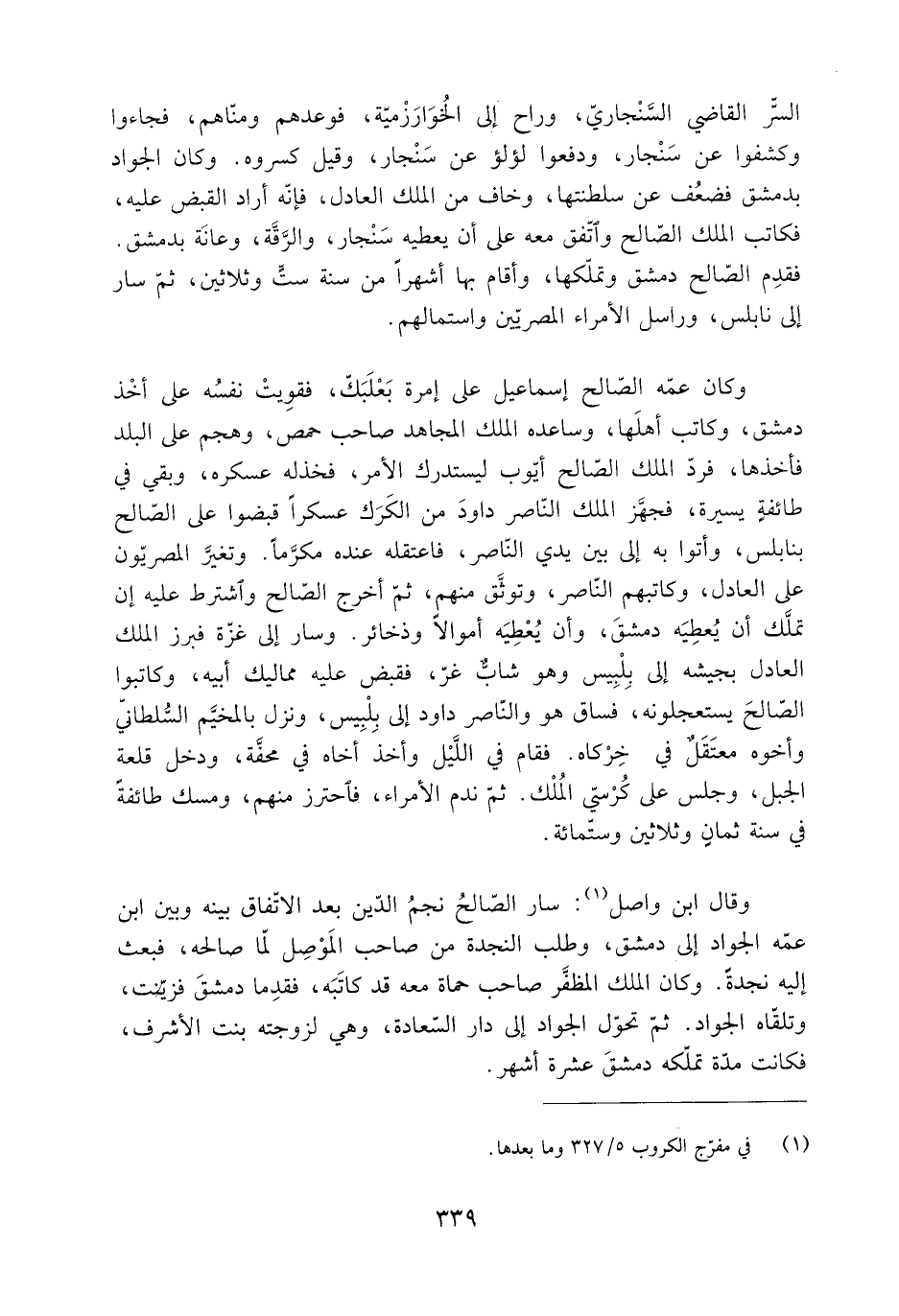 وقال ابن واصل [1] : سار الصّالحُ نجمُ الدّين بعد الاتّفاق بينه وبين ابن عمّه الجواد إلى دمشق، وطلب النجدة من صاحب المَوْصِل لمّا صالحه، فبعث إِلَيْهِ نجدة. وكان الملك المظفَّر صاحب حماة معه قد كاتَبَه، فقدِما دمشقَ فزيّنت، وتلقّاه الجواد. ثُمَّ تحوّل الجواد إلى دار السّعادة، وهي لزوجته بِنْت الأشرف، فكانت مدّة تملّكه دمشق عشرة أشهر.