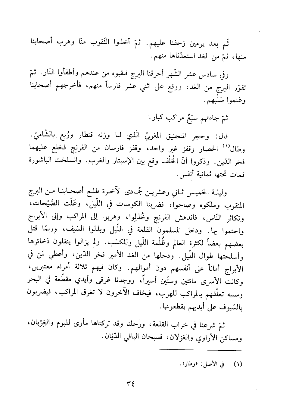 وليلة الخميس ثاني وعشرين جُمادى الآخرة طلع أصحابنا من البرج المنقوب وملكوه وصاحوا، فضربنا الكوسات فِي اللّيل، وعَلَت الصَّيْحات، وتكاثر النّاس، فاندهش الفرنج وخُذلِوا، وهربوا إلى المراكب وإلى الأبراج واحتموا بِهَا. ودخل المسلمون القلعة فِي اللّيل وبذلوا السّيف، وربّما قتل بعضهم بعضا لكثرة العالم وظُلْمة اللّيل وللكسْب. ولم يزالوا ينقلون ذخائرها وأسلحتها طوال اللّيل. ودخلها من الغد الأمير فخر الدّين، وأعطى مَن فِي الأبراج أمانا عَلَى أنفسهم دون أموالهم. وكان فيهم ثلاثة أمراء معتبرين، وكانت الأسرى مائتين وستّين أسيرا، ووجدنا غرقى وأيدي مقطّعة فِي البحر وسببه تعلّقهم بالمراكب للهرب، فيخاف الآخرون لا تغرق المراكب، فيضربون بالسّيوف عَلَى أيديهم يقطعونها.