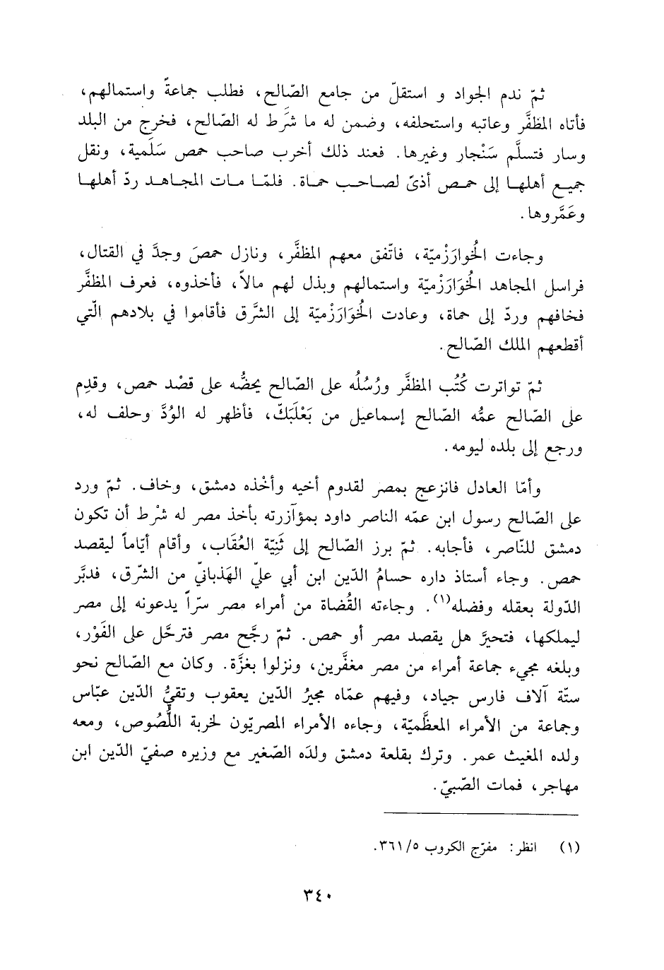 ثُمَّ تواترت كُتُب المظفَّر ورُسُلُه عَلَى الصّالح يحضُّه عَلَى قصْد حمص، وقدِم عَلَى الصّالح عمُّه الصّالح إِسْمَاعِيل من بَعْلَبَكّ، فأظهر لَهُ الوُدَّ وحلف لَهُ، ورجع إلى بلده ليومه.