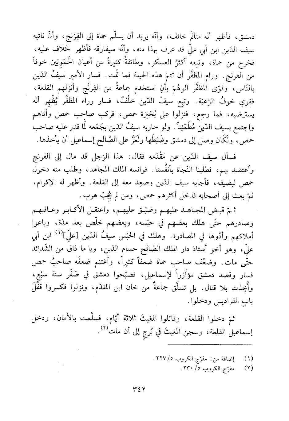 دمشق، فأظهر أَنَّهُ متألّم خائف، وَأَنَّهُ يريد أن يسلّم حماة إلى الفِرَنج، وأنّ نائبة سيف الدّين ابن أَبِي عَلِيّ قد عرف بهذا منه، وَأَنَّهُ سيفارقه فأظهر الخلاف عَلَيْهِ، فخرج من حماة، وتبِعه أكثرُ العسكر، وطائفةٌ كثيرةٌ من أعيان الحَمَوِيّين خوفا من الفرنج. ورام المظفَّر أن تتمّ هذه الحيلة فما تمّت. فسار الأمير سيفُ الدّين بالنّاس، وقوّى المظفَّر الوهْمَ بأنِ استخدم جماعة من الفِرنْج وأنزلهم القلعة، فقوي خوفُ الرّعيّة. وتبِع سيفَ الدّين خلْفٌ، فسار وراء المظفَّر يُظْهِر أَنَّهُ يسترضيه، فما رجع، فنزلوا عَلَى بُحَيْرة حمص، فركب صاحب حمص وأتاهم واجتمع بسيف الدّين مُطْمَئِنًّا. ولو حاربه سيفُ الدّين بجَمْعه لَمَا قدر عَلَيْهِ صاحب حمص، ولَكَان وصل إلى دمشق وضَبَطَها ولَعَزَّ عَلَى الصّالح إِسْمَاعِيل أن يأخذها.