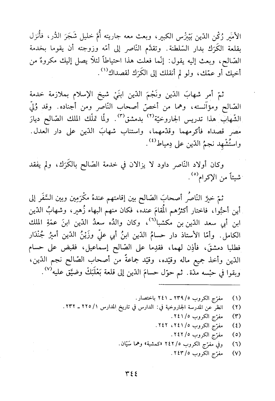 ثُمَّ أمر شهابَ الدّين ونَجْمَ الدّين ابنَيْ شيخ الإِسْلَام بملازمة خدمة الصّالح ومؤانسته، وهما من أخصّ أصحاب النّاصر ومن أجناده. وقد وُليّ الشّهاب هذا تدريس الجاروخيّة [2] بدمشق [3] . ولمّا تملّك الملك الصّالح ديارَ مصر قصداه فأكرمهما وقدّمهما، واستناب شهابَ الدّين عَلَى دار العدل.