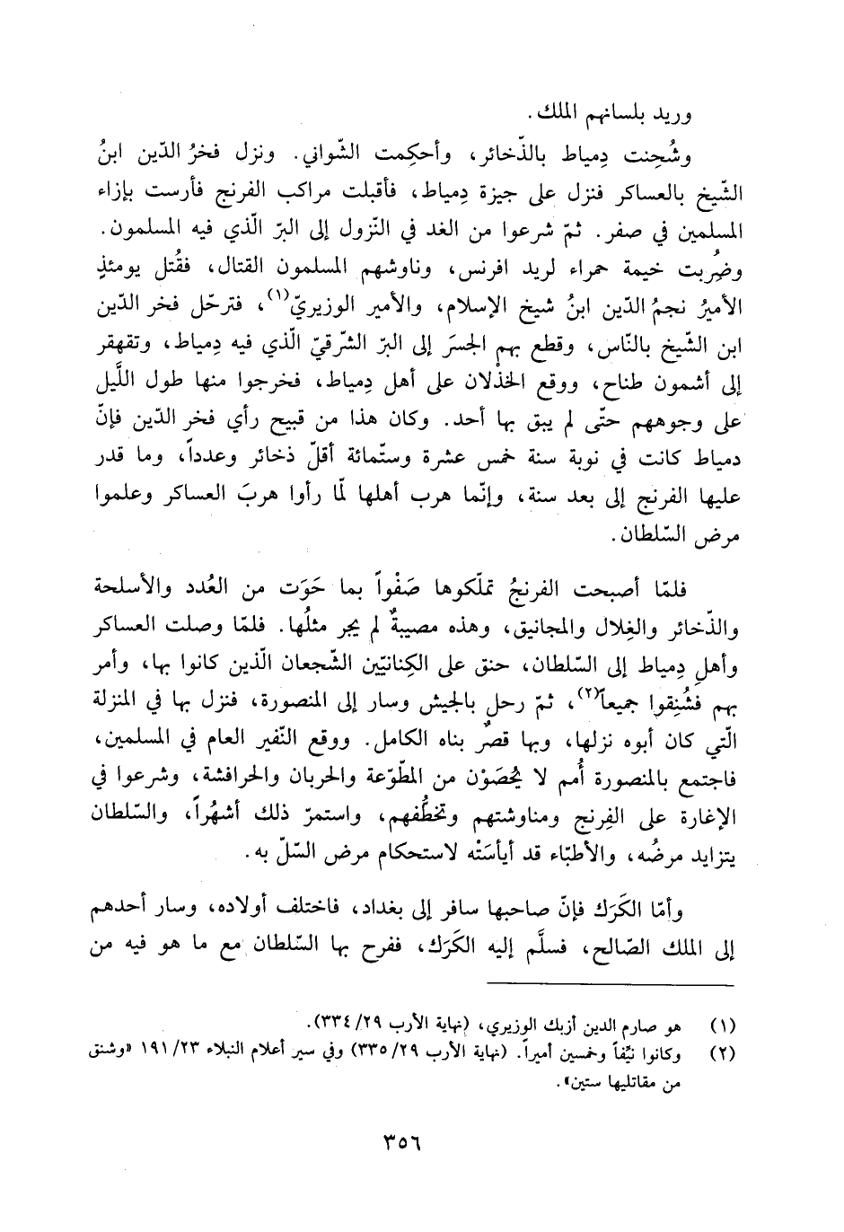 وشُحِنت دِمياط بالذّخائر، وأحكِمت الشّواني. ونزل فخر الدّين ابن الشَّيْخ بالعساكر فنزل عَلَى جيزة دِمياط، فأقبلت مراكب الفرنج فأرسلت بإزاء المسلمين فِي صفر. ثُمَّ شرعوا من الغد فِي النّزول إلى البرّ الَّذِي فِيهِ المسلمون.