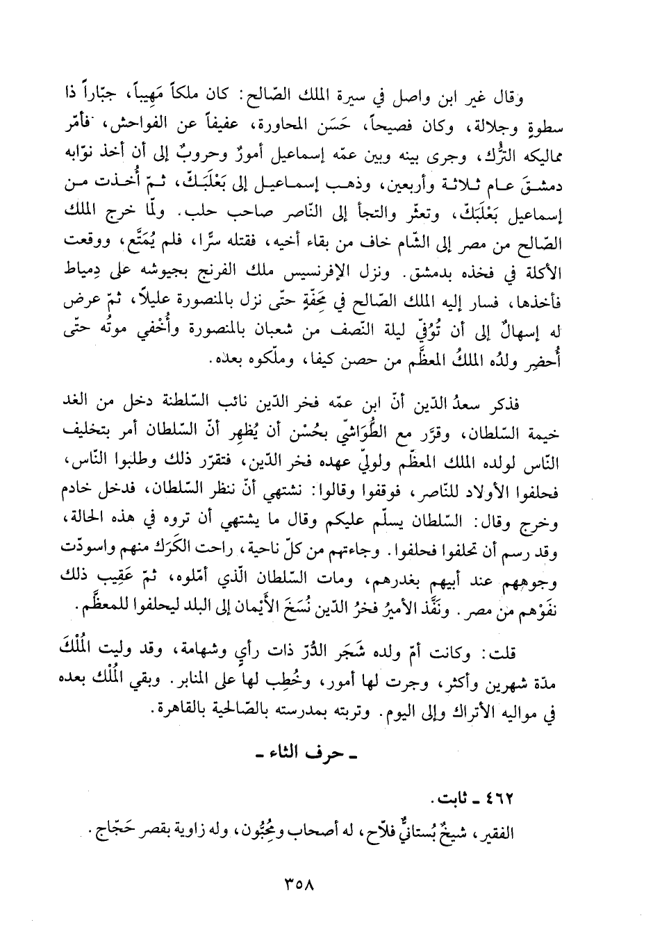 قلت: وكانت أمّ ولده شَجَر الدُّرّ ذات رأيٍ وشهامة، وقد وليت المُلْكَ مدّة شهرين وأكثر، وجرت لَهَا أمور، وخُطِب لَهَا عَلَى المنابر. وبقي المُلْك بعده فِي مواليه الأتراك وإلى اليوم. وتربته بمدرسته بالصّالحية بالقاهرة.