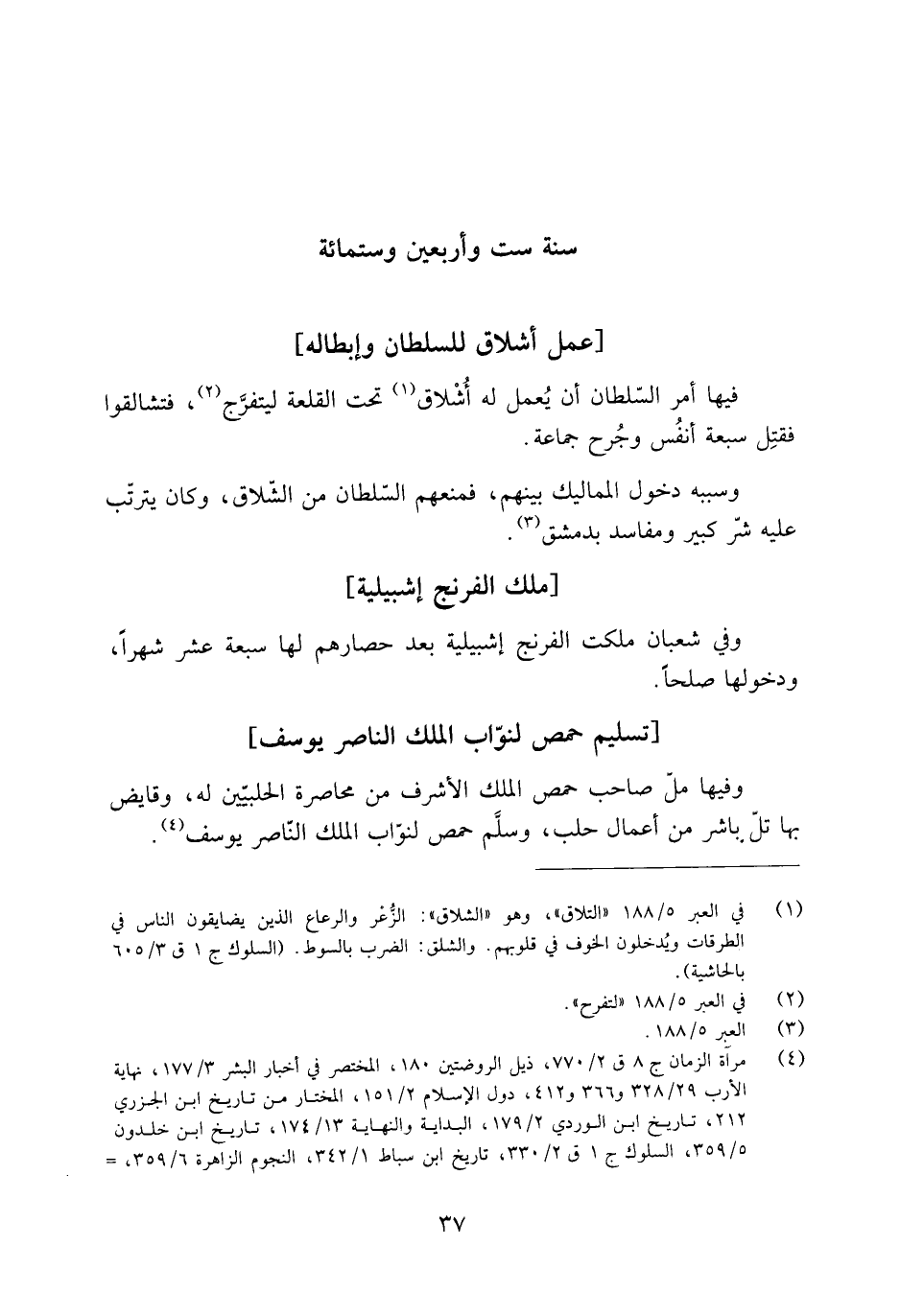 [4] مرآة الزمان ج 8 ق 2/ 770، ذيل الروضتين 180، المختصر في أخبار البشر 3/ 177، نهاية الأرب 29/ 328 و 366 و 412، دول الإسلام 2/ 151، المختار من تاريخ ابن الجزري 212، تاريخ ابن الوردي 2/ 179، البداية والنهاية 13/ 174، تاريخ ابن خلدون 5/ 359، السلوك ج 1 ق 2/ 330، تاريخ ابن سباط 1/ 342، النجوم الزاهرة 6/ 359،