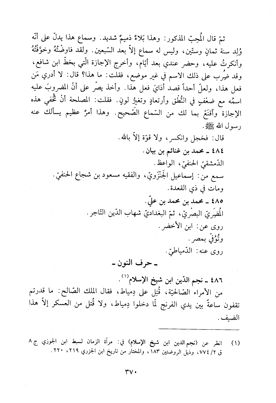 [1] انظر عن (نجم الدين ابن شيخ الإسلام) في: مرآة الزمان لسبط ابن الجوزي ج 8 ق 2/ 774، وذيل الروضتين 183، والمختار من تاريخ ابن الجزري 219، 220.
