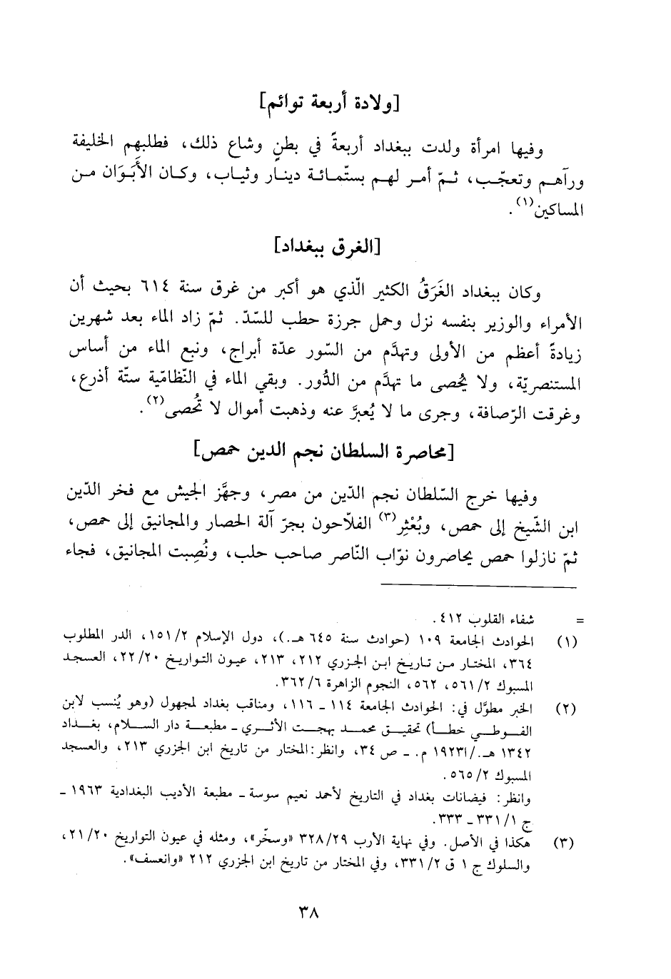 [2] الخبر مطوّل في: الحوادث الجامعة 114- 116، ومناقب بغداد لمجهول (وهو ينسب لابن الفوطي خطأ) تحقيق محمد بهجت الأثري- مطبعة دار السلام، بغداد 1342 هـ. / 1923 م. - ص 34، وانظر: المختار من تاريخ ابن الجزري 213، والعسجد المسبوك 2/ 565.