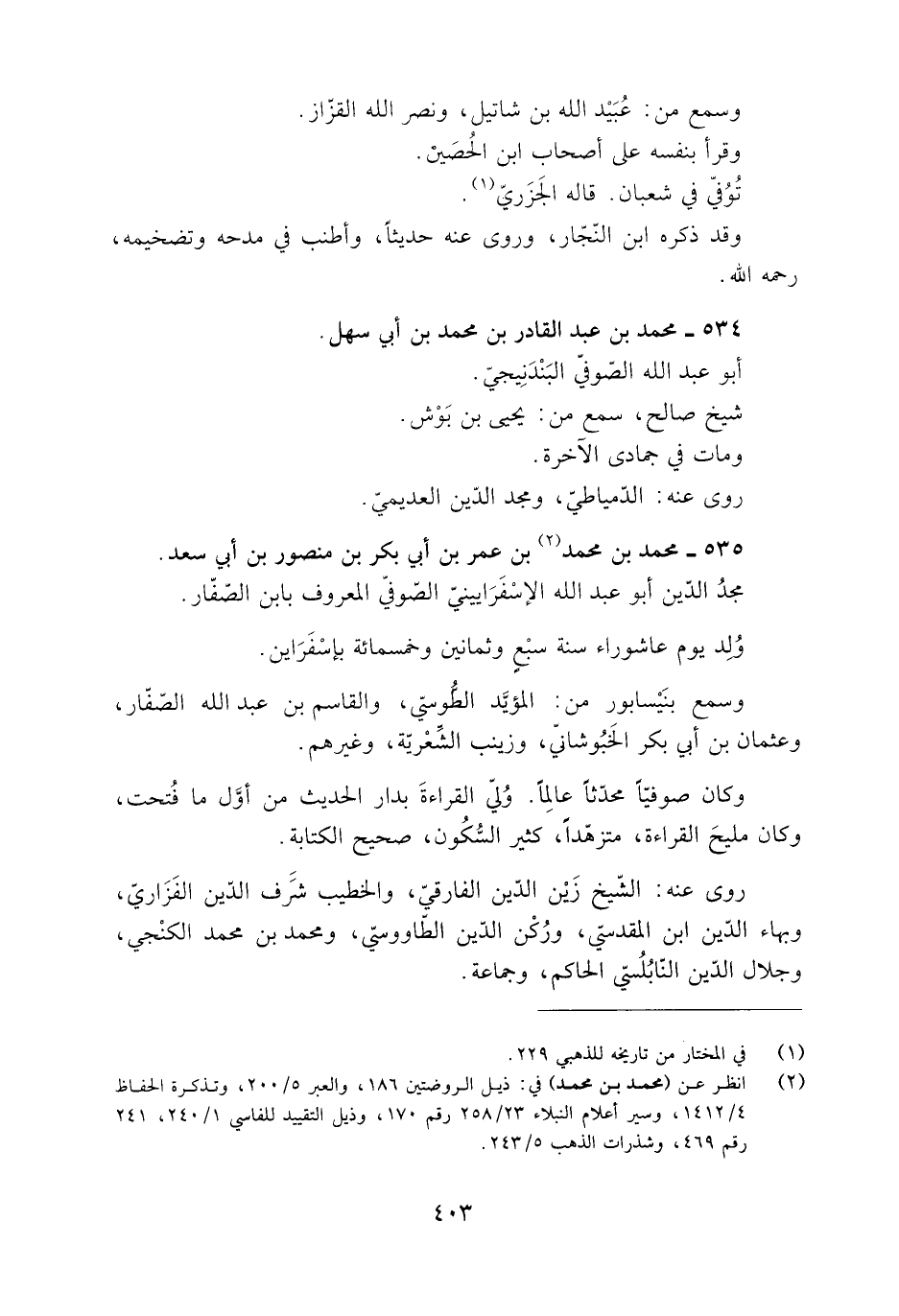 [2] انظر عن (محمد بن محمد) في: ذيل الروضتين 186، والعبر 5/ 200، وتذكرة الحفاظ 4/ 1412، وسير أعلام النبلاء 23/ 258 رقم 170، وذيل التقييد للفاسي 1/ 240، 241 رقم 469، وشذرات الذهب 5/ 243.