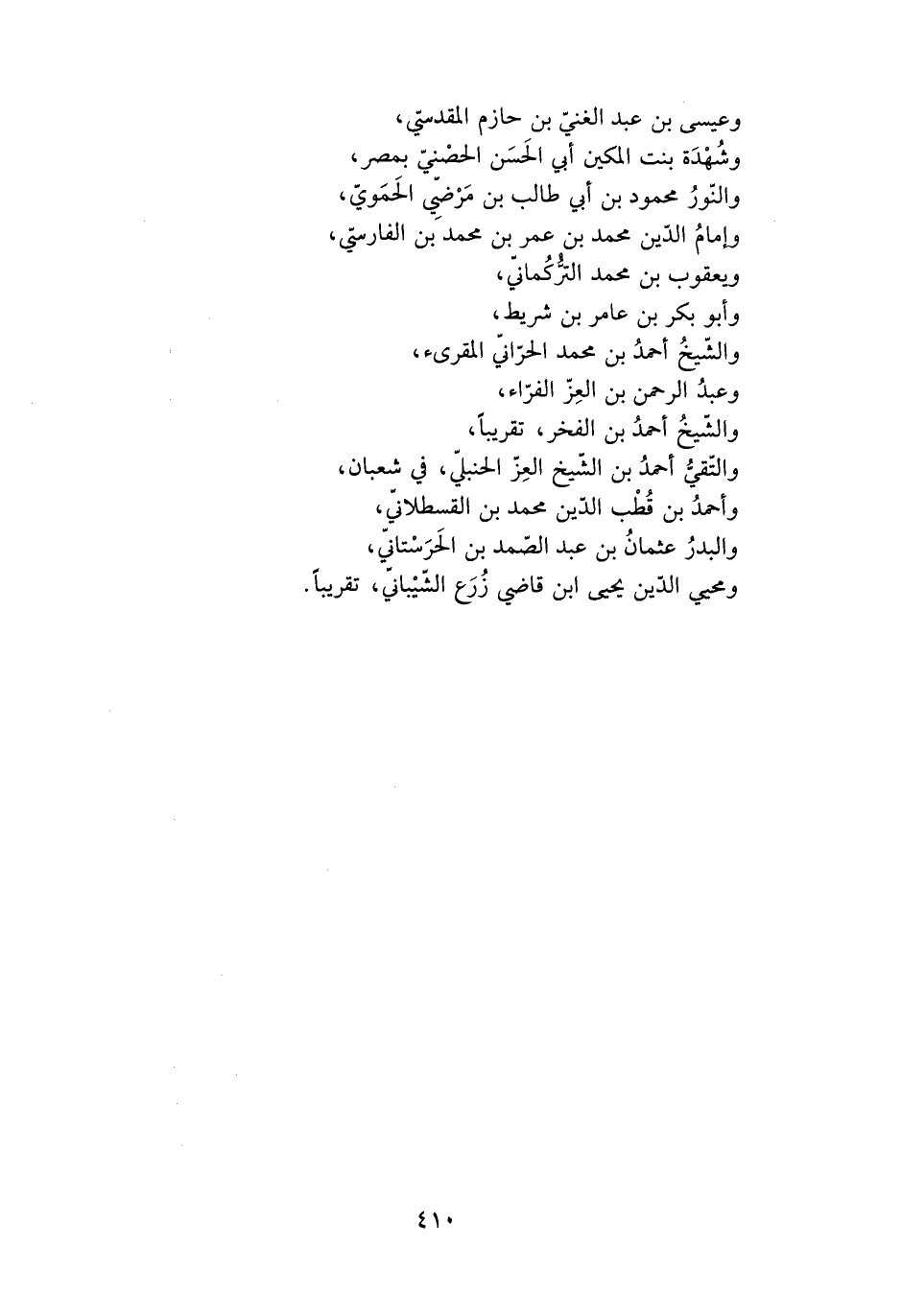وعيسى بْن عَبْد الغنيّ بْن حازم المقدسيّ، وشُهْدَة بِنْت المكين أَبِي الحَسَن الحصْنيّ بمصر، والنّورُ محمود بْن أَبِي طَالِب بْن مَرْضِيّ الحَمَويّ، وإمامُ الدّين مُحَمَّد بْن عُمَر بْن مُحَمَّد بْن الفارسيّ، ويعقوب بْن مُحَمَّد التُّرْكُمانيّ، وَأَبُو بَكْر بْن عامر بْن شريط، وَالشَّيْخُ أَحْمَدُ بْن مُحَمَّد الحرّانيّ المقرئ، وَعَبْدُ الرَّحْمَن بْن العِزّ الفرّاء، وَالشَّيْخُ أَحْمَدُ بْن الفخر، تقريبا، والتّقيُّ أَحْمَدُ بْن الشَّيْخ العِزّ الحنبلي، فِي شعبان، وَأَحْمَدُ بْن قُطْب الدّين مُحَمَّد بْن القسطلانيّ، والبدرُ عثمانُ بْن عَبْد الصّمد بْن الحَرَسْتانيّ، ومحيي الدّين يحيى ابن قاضي زرع الشّيبانيّ، تقريبا.