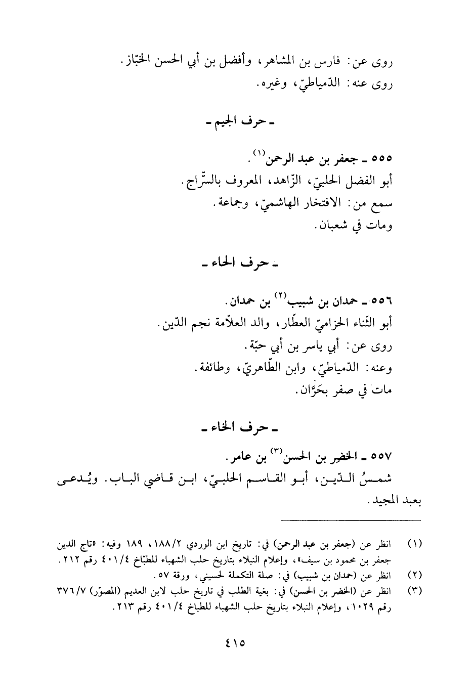 [3] انظر عن (الخضر بن الحسن) في: بغية الطلب في تاريخ حلب لابن العديم (المصوّر) 7/ 376 رقم 1029، وإعلام النبلاء بتاريخ حلب الشهباء للطباخ 4/ 401 رقم 213.