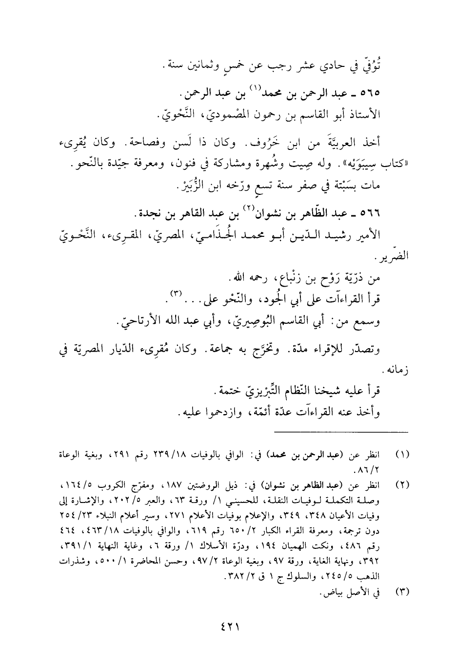 قرأ القراءات عَلَى أَبِي الْجُود، والنّحْو عَلَى ... [3] .