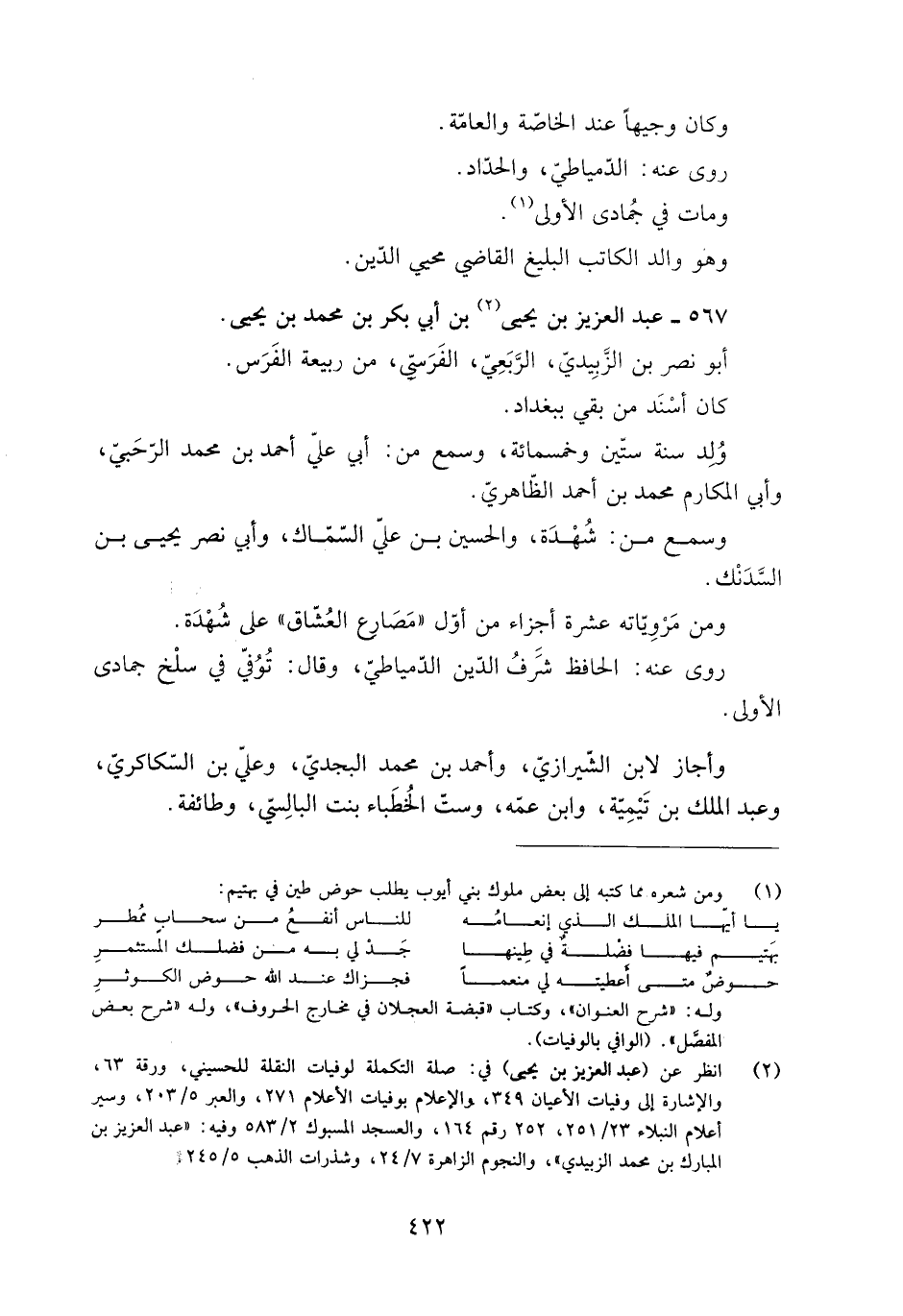 [2] انظر عن (عبد العزيز بن يحيى) في: صلة التكملة لوفيات النقلة للحسيني، ورقة 63، والإشارة إلى وفيات الأعيان 349، والإعلام بوفيات الأعلام 271، والعبر 5/ 203، وسير أعلام النبلاء 23/ 251، 252 رقم 164، والعسجد المسبوك 2/ 583 وفيه: «عبد العزيز بن المبارك بن محمد الزبيدي» ، والنجوم الزاهرة 7/ 24، وشذرات الذهب 5/ 245.