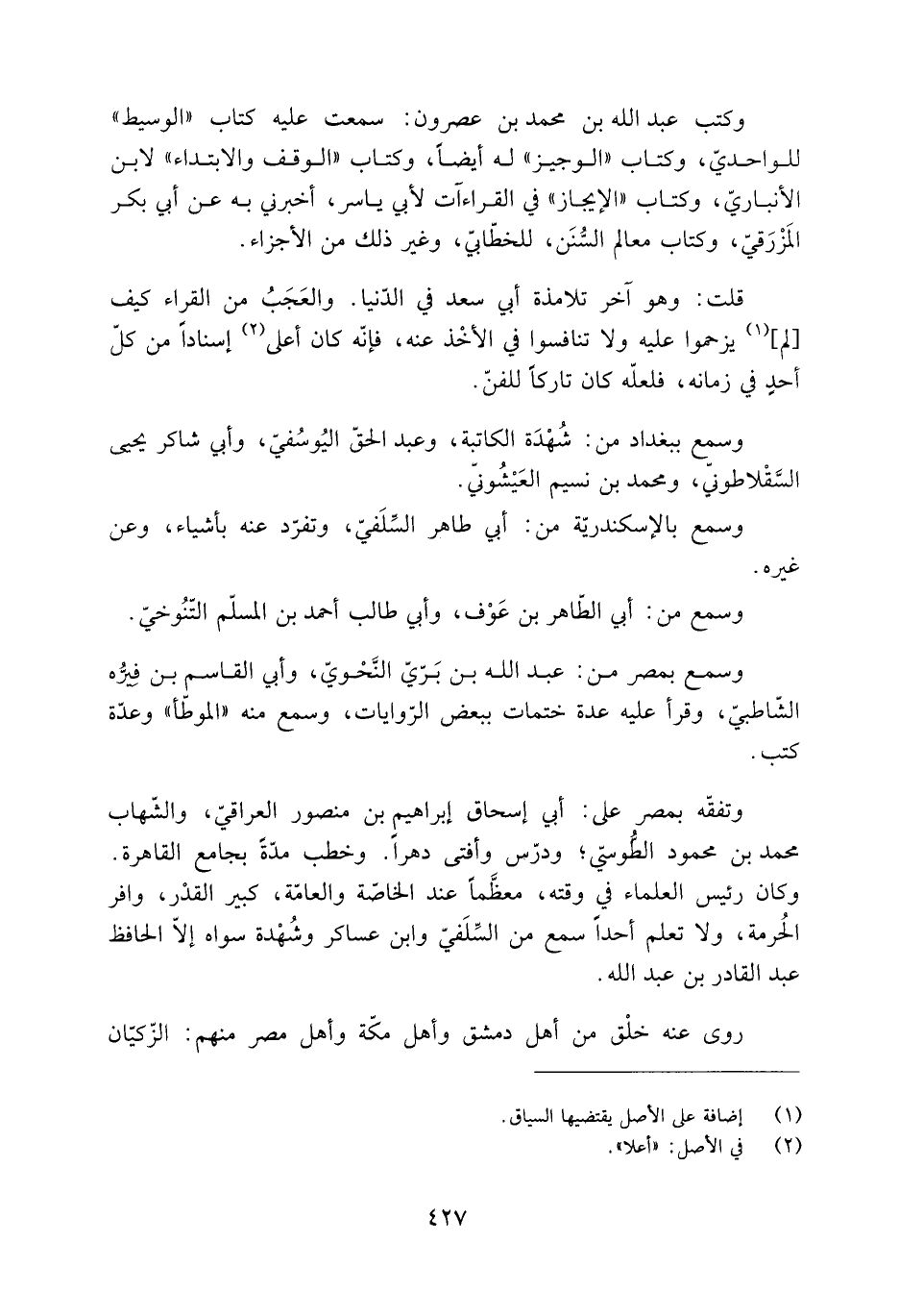 قلت: وهو آخر تلامذة أَبِي سعد فِي الدّنيا. والعَجَبُ من القراء كيف [لم] [1] يزحموا عَلَيْهِ ولا تنافسوا فِي الأخْذ عَنْهُ، فإنّه كَانَ أعلى [2] إسنادا من كلّ أحدٍ فِي زمانه، فلعلّه كَانَ تاركا للفنّ.