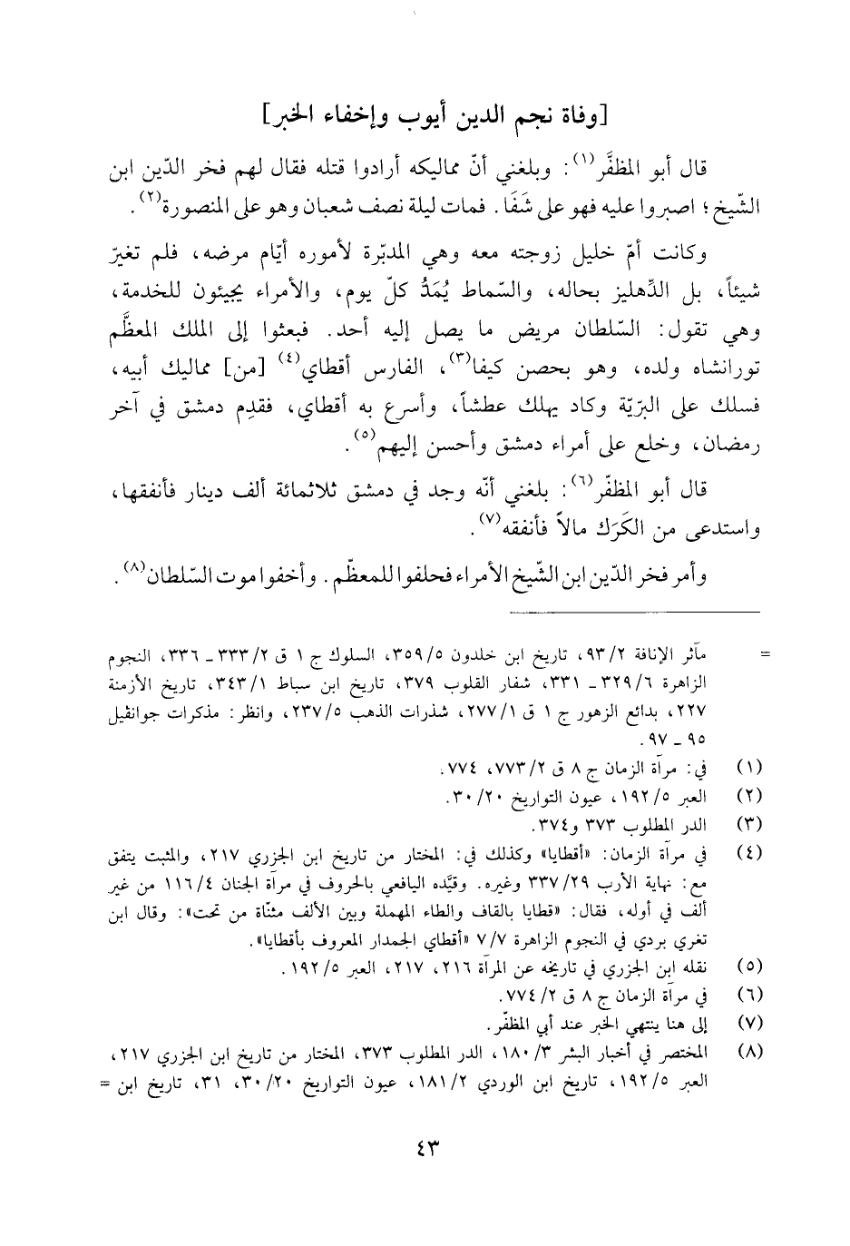 وكانت أمّ خليل زوجته معه وهي المدبّرة لأموره أيّام مرضه، فلم تغيّر شيئا، بل الدِّهليز بحاله، والسّماط يُمَدُّ كلّ يوم، والأمراء يجيئون للخدمة، وهي تَقُولُ: السّلطان مريض ما يصل إليه أحد. فبعثوا إلى الملك المعظّم توران شاه ولده، وهو بحصن كيفا [3] ، الفارس أقطاي [4] [من] مماليك أَبِيهِ، فسلك عَلَى البرّيّة وكاد يهلك عطشا، وأسرع بِهِ أقطاي، فقدِم دمشق فِي آخر رمضان، وخلع عَلَى أمراء دمشق وأحسن إليهم [5] .