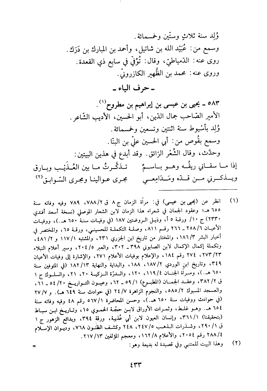 [1] انظر عن (يحيى بن عيسى) في: مرآة الزمان ج 8 ق 2/ 788، 789 وفيه وفاته سنة 655 هـ.، وعقود الجمان في شعراء هذا الزمان لابن الشعار الموصلي (نسخة أسعد أفندي 2330) ج 10/ ورقة 5 أ، وذيل الروضتين 187 (في وفيات سنة 650 هـ) ، ووفيات الأعيان 6/ 258- 266 رقم 811، وصلة التكملة للحسيني، ورقة 65، والمختصر في أخبار البشر 3/ 186، والمختار من تاريخ ابن الجزري 231، والمشتبه 1/ 117 و 2/ 481، وتكملة إكمال الإكمال لابن الصابوني 398- 302، والعبر 5/ 204، وسير أعلام النبلاء 23/ 273، 274 رقم 184، والإعلام بوفيات الأعلام 271، والإشارة إلى وفيات الأعيان 349، وتاريخ ابن الوردي 2/ 187، 188، والبداية والنهاية 13/ 182 (في المتوفين سنة 650 هـ) ، ومرآة الجنان 4/ 119، 120، والدرّة الزكية 20، 21، والسلوك ج 1 ق 2/ 382، وعقد الجمان (المطبوع) 1/ 59- 62، وعيون التواريخ 20/ 54- 61، والعسجد المسبوك 2/ 585، والنجوم الزاهرة 7/ 24 (في حوادث سنة 649 هـ) . و 7/ 27 (في حوادث ووفيات سنة 650 هـ.) ، وحسن المحاضرة 1/ 567 رقم 48 وفيه وفاته سنة 654 هـ. وهو غلط، وثمرات الأوراق لابن حجّة الحموي 15، وتاريخ ابن سباط (بتحقيقنا) 1/ 361، وإنسان العيون لابن أبي عذيبة، ورقة 394، وبدائع الزهور ج 1 ق 1/ 290، وشذرات الذهب 5/ 247، 248 وكشف الظنون 768، وديوان الإسلام 4/ 288 رقم 2054، والأعلام 8/ 162، ومعجم المؤلفين 13/ 217.