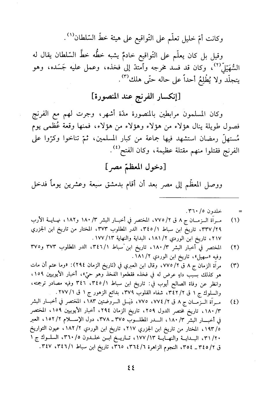[4] مرآة الزمان ج 8 ق 2/ 774، 775، ذيل الروضتين 183، المختصر في أخبار البشر 3/ 180، تاريخ مختصر الدول 259، تاريخ الزمان 294، أخبار الأيوبيين 159، المختصر في أخبار البشر 3/ 180، الدر المطلوب 375- 378، دول الإسلام 2/ 152، العبر 5/ 193، المختار من تاريخ ابن الجزري 217، تاريخ ابن الوردي 2/ 182، عيون التواريخ 20/ 31، البداية والنهاية 13/ 177، تاريخ ابن خلدون 5/ 360، السلوك ج 1 ق 2/ 345- 354، النجوم الزاهرة 6/ 364، 365، تاريخ ابن سباط 1/ 346، 347.