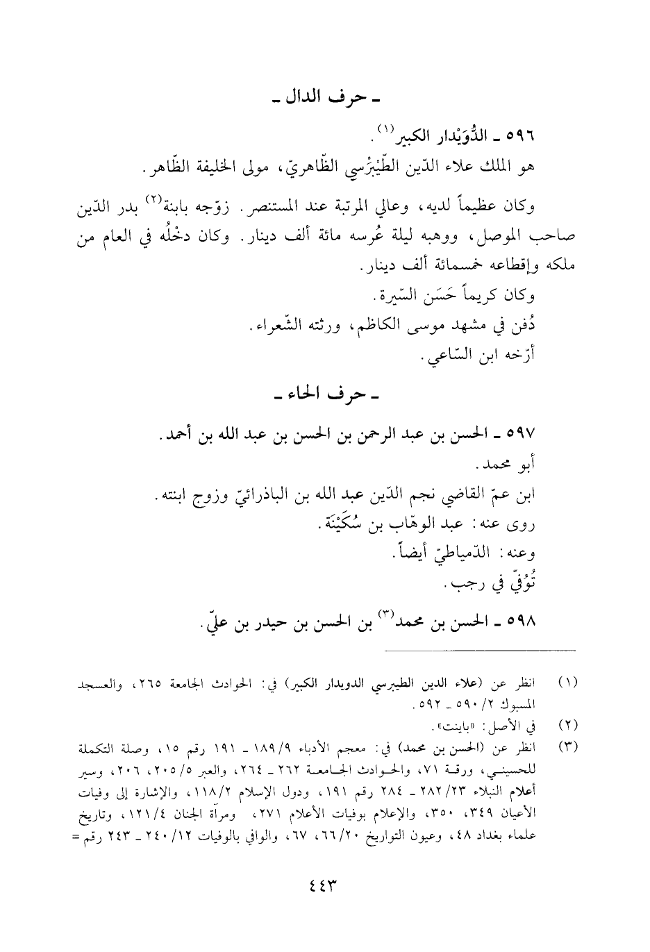 [3] انظر عن (الحسن بن محمد) في: معجم الأدباء 9/ 189- 191 رقم 15، وصلة التكملة للحسيني، ورقة 71، والحوادث الجامعة 262- 264، والعبر 5/ 205، 206، وسير أعلام النبلاء 23/ 282- 284 رقم 191، ودول الإسلام 2/ 118، والإشارة إلى وفيات الأعيان 349، 350، والإعلام بوفيات الأعلام 271، ومرآة الجنان 4/ 121، وتاريخ علماء بغداد 48، وعيون التواريخ 20/ 66، 67، والوافي بالوفيات 12/ 240- 243 رقم
