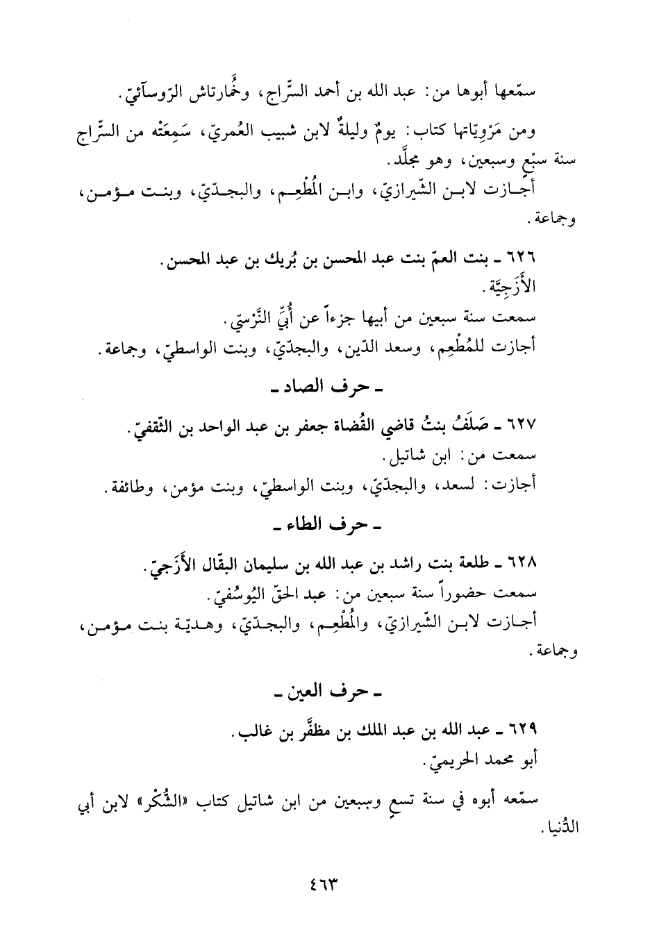 628- طلعة بِنْت راشد بْن عَبْد اللَّه بْن سُلَيْمَان البقّال الأَزَجيّ.
