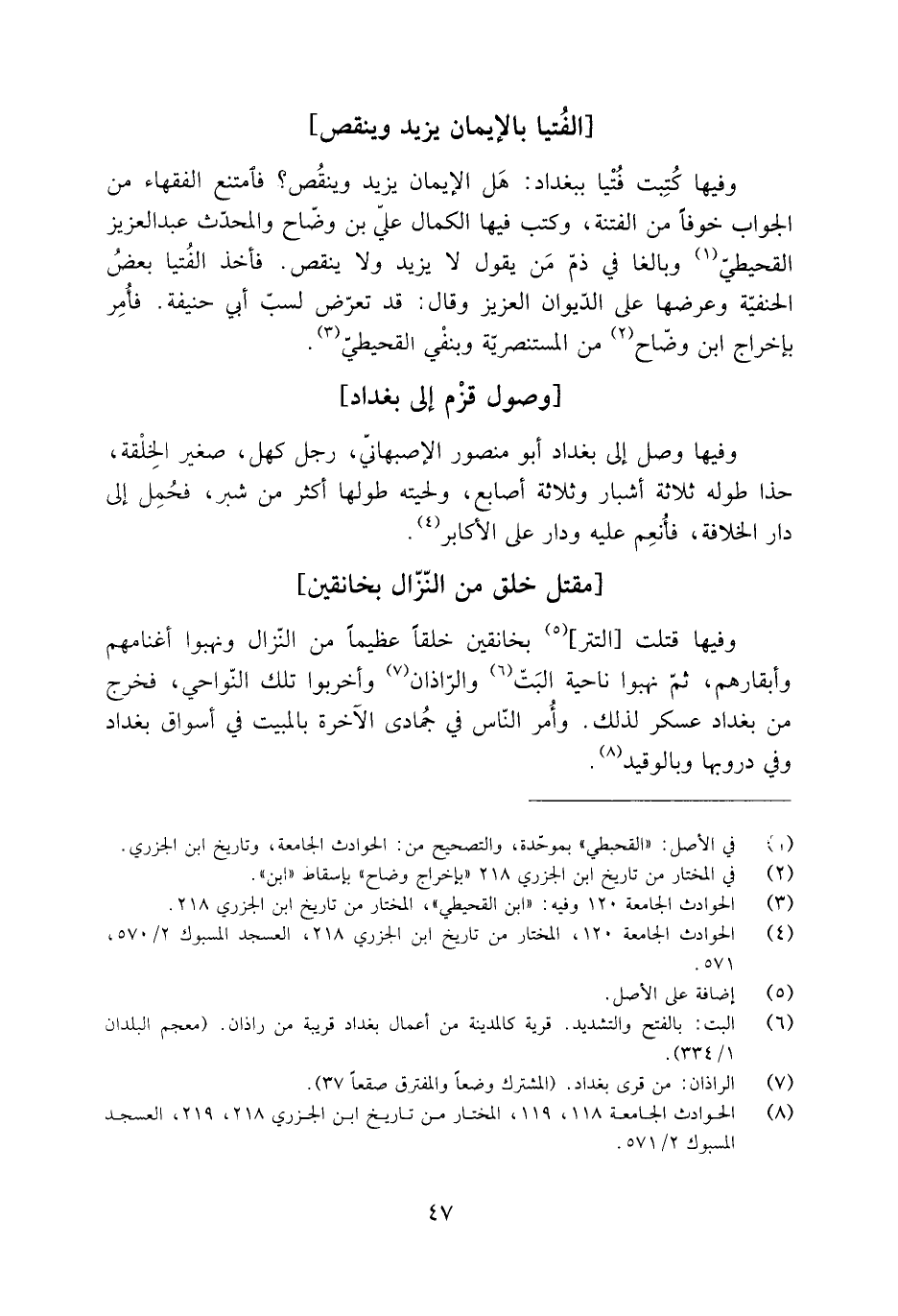 [8] الحوادث الجامعة 118، 119، المختار من تاريخ ابن الجزري 218، 219، العسجد المسبوك 2/ 571.