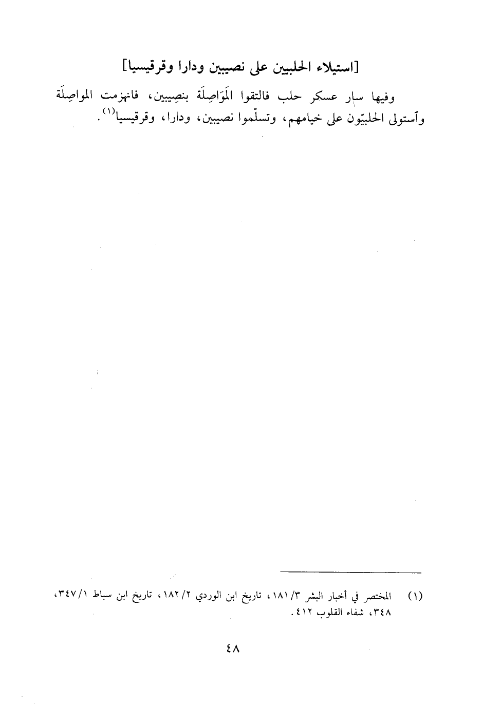 وفيها سار عسكر حلب فالتقوا المَوَاصِلَة بنصِيبين، فانهزمت المواصِلَة واستولى الحلبيّون عَلَى خيامهم، وتسلّموا نصيبين، ودارا، وقرقيسيا [1] .