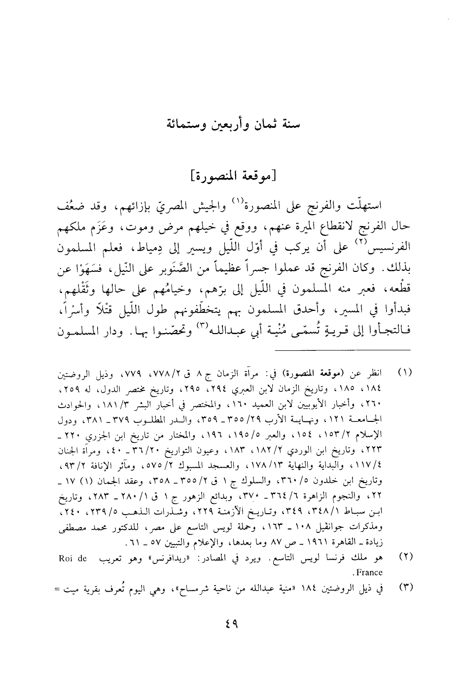 [1] انظر عن (موقعة المنصورة) في: مرآة الزمان ج 8 ق 2/ 778، 779، وذيل الروضتين 184، 185، وتاريخ الزمان لابن العبري 294، 295، وتاريخ مختصر الدول، له 259، 260، وأخبار الأيوبيين لابن العميد 160، والمختصر في أخبار البشر 3/ 181، والحوادث الجامعة 121، ونهاية الأرب 29/ 355- 359، والدر المطلوب 379- 381، ودول الإسلام 2/ 153، 154، والعبر 5/ 195، 196، والمختار من تاريخ ابن الجزري 220- 223، وتاريخ ابن الوردي 2/ 182، 183، وعيون التواريخ 20/ 36- 40، ومرآة الجنان 4/ 117، والبداية والنهاية 13/ 178، والعسجد المسبوك 2/ 575، ومآثر الإنافة 2/ 93، وتاريخ ابن خلدون 5/ 360، والسلوك ج 1 ق 2/ 355- 358، وعقد الجمان (1) 17- 22، والنجوم الزاهرة 6/ 364- 370، وبدائع الزهور ج 1 ق 1/ 280- 283، وتاريخ ابن سباط 1/ 348، 349، وتاريخ الأزمنة 229، وشذرات الذهب 5/ 239، 240، ومذكرات جوانقيل 108- 163، وحملة لويس التاسع على مصر، للدكتور محمد مصطفى زيادة- القاهرة 1961- ص 87 وما بعدها، والإعلام والتبيين 57- 61.