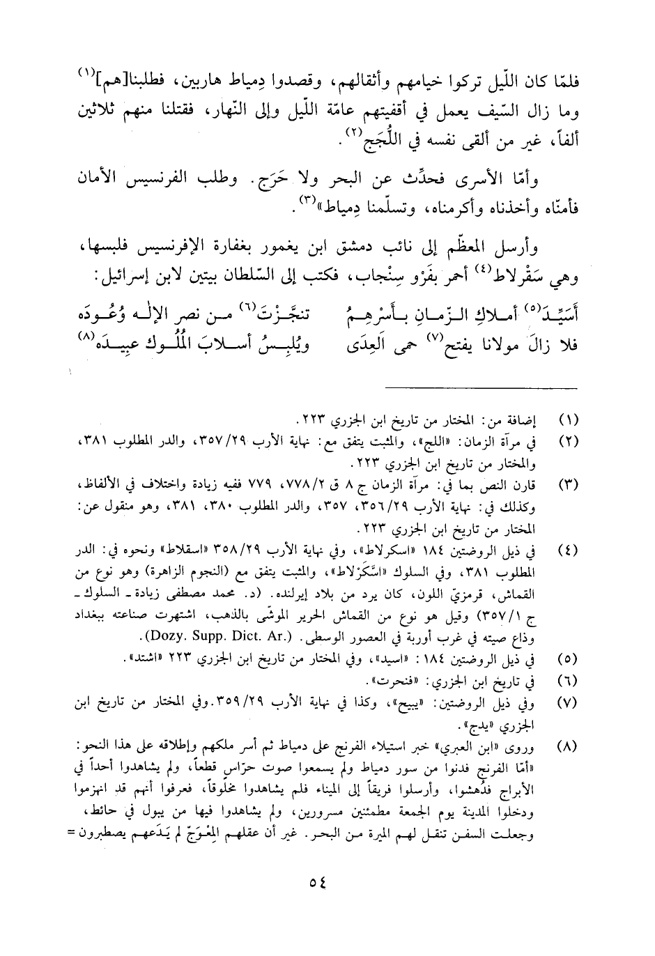 [4] في ذيل الروضتين 184 «اسكرلاط» ، وفي نهاية الأرب 29/ 358 «اسقلاط» ونحوه في: الدر المطلوب 381، وفي السلوك «اسكرلاط» ، والمثبت يتفق مع (النجوم الزاهرة) وهو نوع من القماش، قرمزيّ اللون، كان يرد من بلاد إيرلنده. (د. محمد مصطفى زيادة- السلوك- ج 1/ 357) وقيل هو نوع من القماش الحرير الموشّى بالذهب، اشتهرت صناعته ببغداد وذاع صيته في غرب أوربة في العصور الوسطى. (Dozy.Supp.Dict.Ar.) .