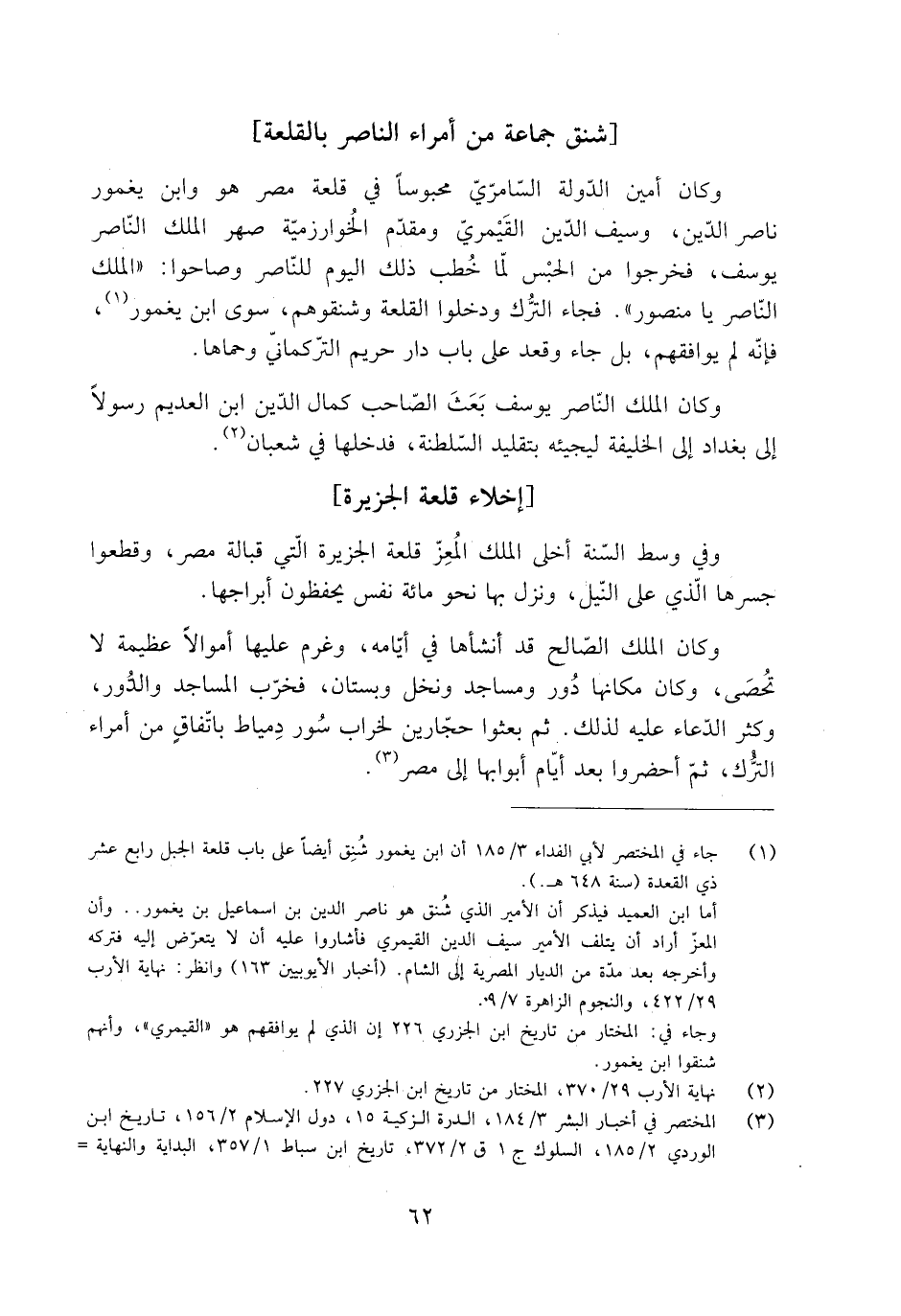 [1] جاء في المختصر لأبي الفداء 3/ 185 أن ابن يغمور شنق أيضا على باب قلعة الجبل رابع عشر ذي القعدة (سنة 648 هـ.) .