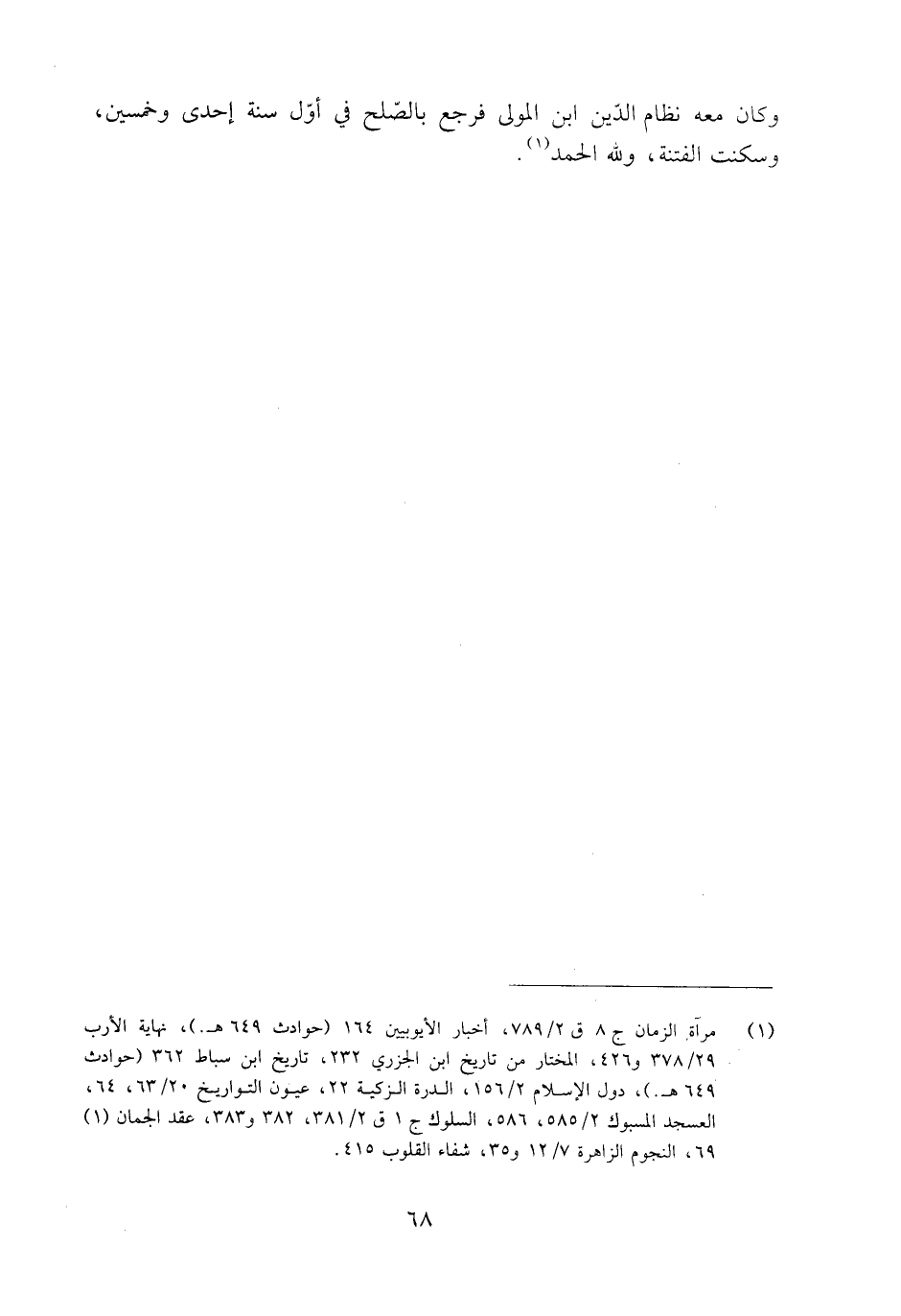 [1] مرآة الزمان ج 8 ق 2/ 789، أخبار الأيوبيين 164 (حوادث 649 هـ.) ، نهاية الأرب 29/ 378 و 426، المختار من تاريخ ابن الجزري 232، تاريخ ابن سباط 362 (حوادث 649 هـ.) ، دول الإسلام 2/ 156، الدرة الزكية 22، عيون التواريخ 20/ 63، 64، العسجد المسبوك 2/ 585، 586، السلوك ج 1 ق 2/ 381، 382 و 383، عقد الجمان (1) 69، النجوم الزاهرة 7/ 12 و 35، شفاء القلوب 415.