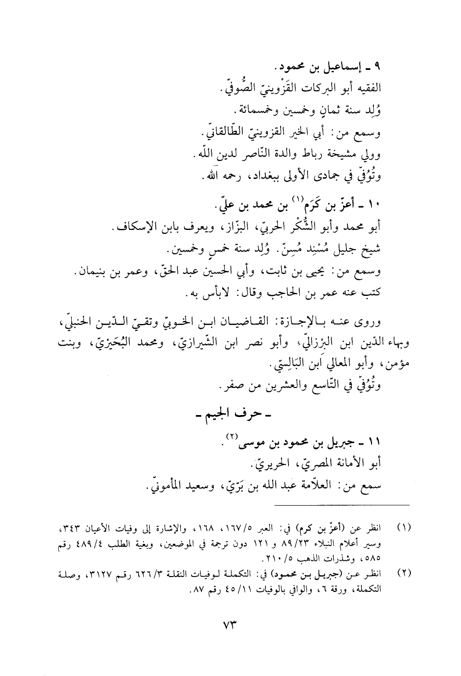 [2] انظر عن (جبريل بن محمود) في: التكملة لوفيات النقلة 3/ 626 رقم 3127، وصلة التكملة، ورقة 6، والوافي بالوفيات 11/ 45 رقم 87.
