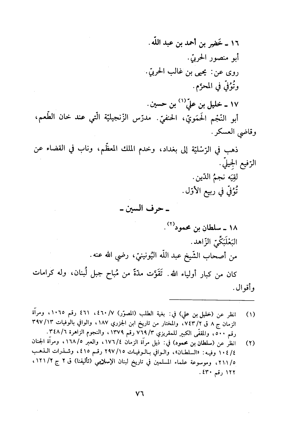 [2] انظر عن (سلطان بن محمود) في: ذيل مرآة الزمان 4/ 176، والعبر 5/ 168، ومرآة الجنان 4/ 104 وفيه: «السلطان» ، والوافي بالوفيات 15/ 297 رقم 415، وشذرات الذهب 5/ 211، وموسوعة علماء المسلمين في تاريخ لبنان الإسلامي (تأليفنا) ق 2 ج 2/ 121، 122 رقم 430.