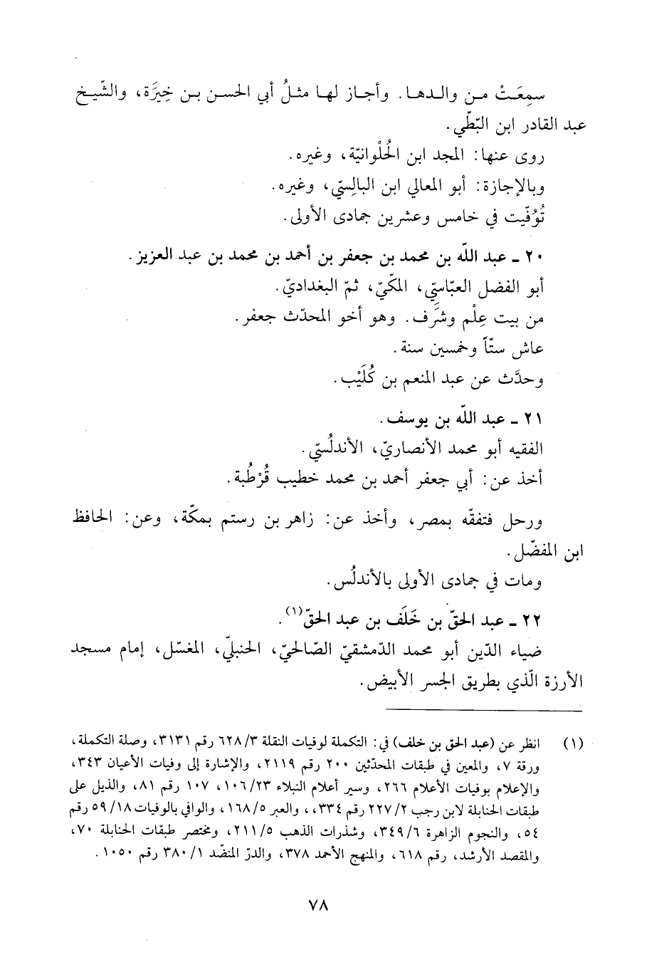 [1] انظر عن (عبد الحق بن خلف) في: التكملة لوفيات النقلة 3/ 628 رقم 3131، وصلة التكملة، ورقة 7، والمعين في طبقات المحدّثين 200 رقم 2119، والإشارة إلى وفيات الأعيان 343، والإعلام بوفيات الأعلام 266، وسير أعلام النبلاء 23/ 106، 107 رقم 81، والذيل على طبقات الحنابلة لابن رجب 2/ 227 رقم 334، والعبر 5/ 168، والوافي بالوفيات 18/ 59 رقم 54، والنجوم الزاهرة 6/ 349، وشذرات الذهب 5/ 211، ومختصر طبقات الحنابلة 70، والمقصد الأرشد، رقم 618، والمنهج الأحمد 378، والدرّ المنضّد 1/ 380 رقم 1050.