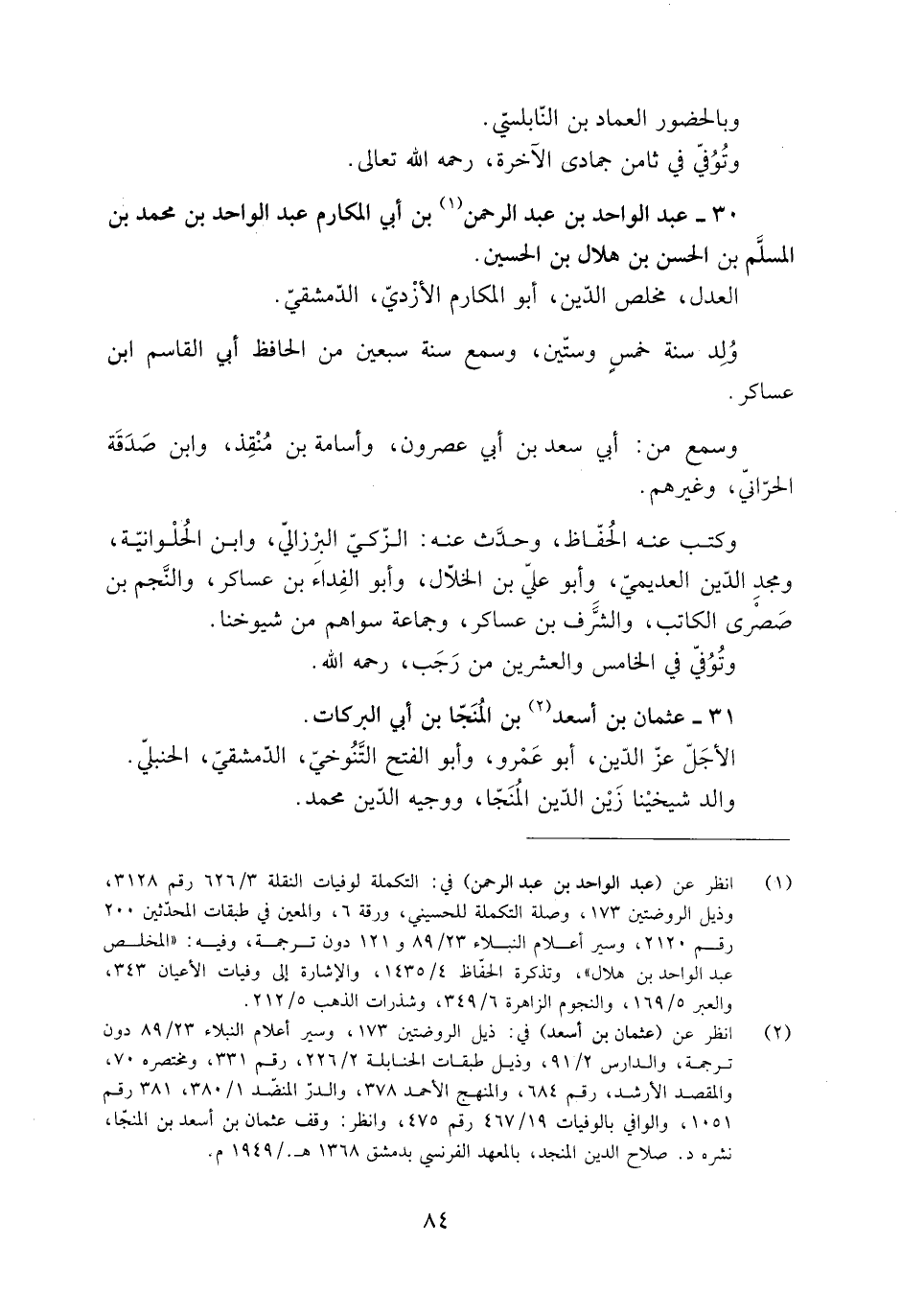 31- عثمان بْن أسعد [2] بْن المُنَجّا بْن أَبِي البركات.
