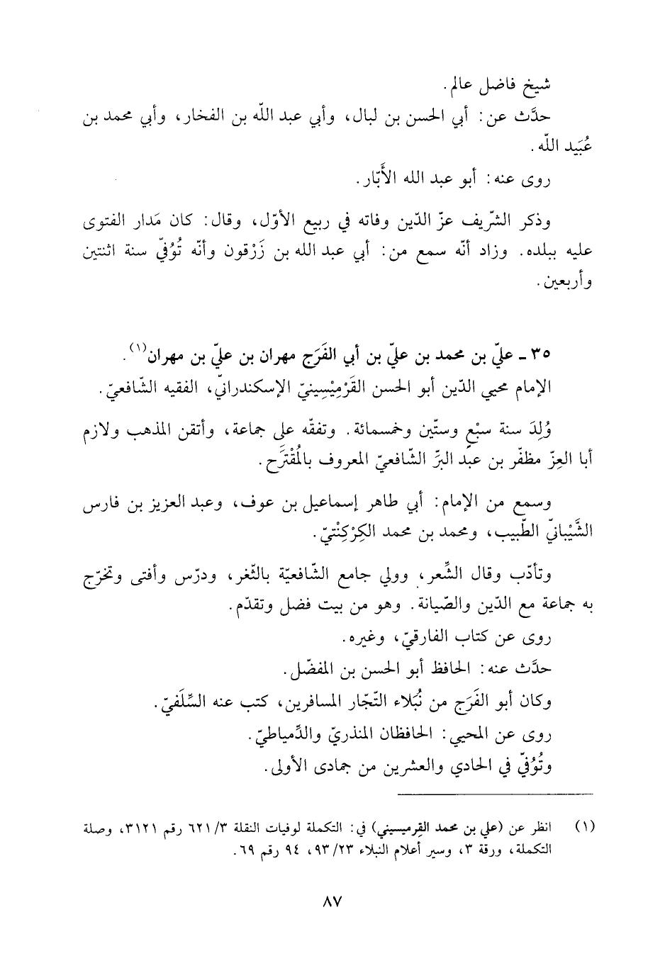 [1] انظر عن (علي بن محمد القرميسيني) في: التكملة لوفيات النقلة 3/ 621 رقم 3121، وصلة التكملة، ورقة 3، وسير أعلام النبلاء 23/ 93، 94 رقم 69.