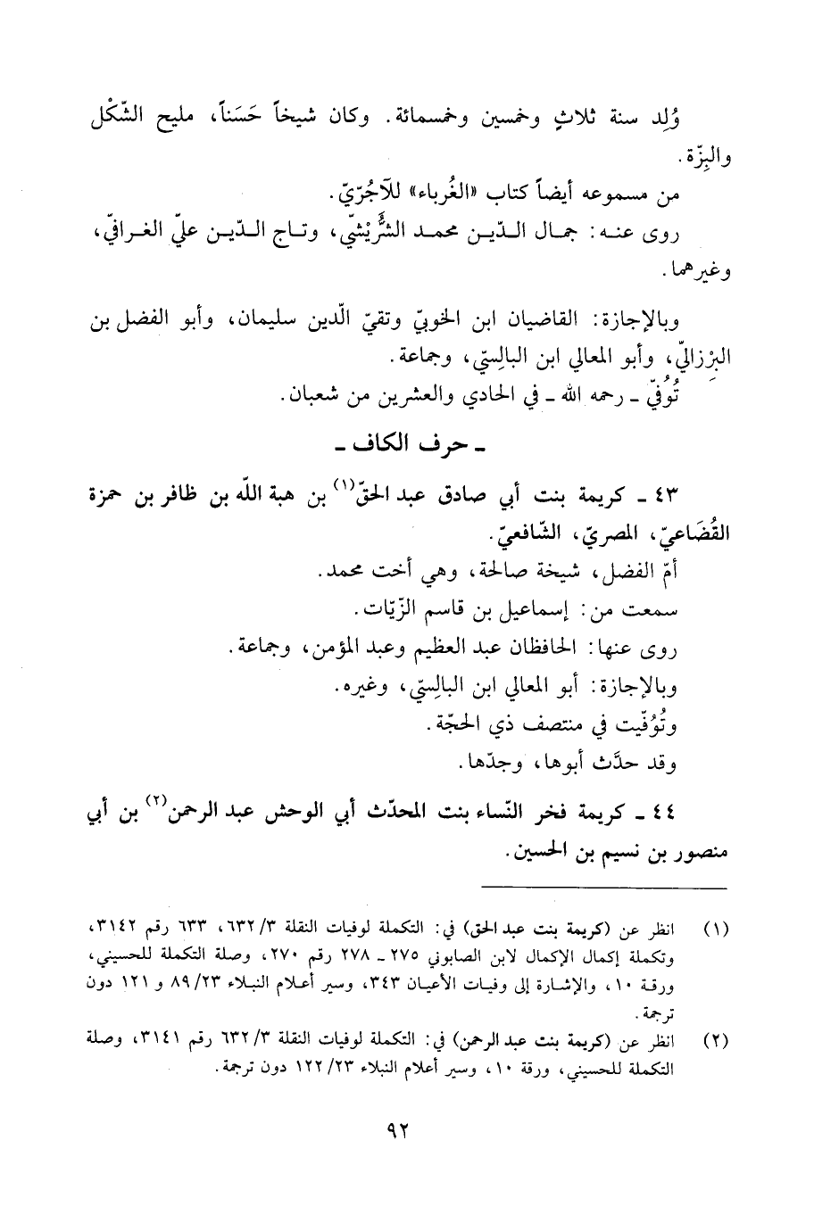 [1] انظر عن (كريمة بنت عبد الحق) في: التكملة لوفيات النقلة 3/ 632، 633 رقم 3142، وتكملة إكمال الإكمال لابن الصابوني 275- 278 رقم 270، وصلة التكملة للحسيني، ورقة 10، والإشارة إلى وفيات الأعيان 343، وسير أعلام النبلاء 23/ 89 و 121 دون ترجمة.