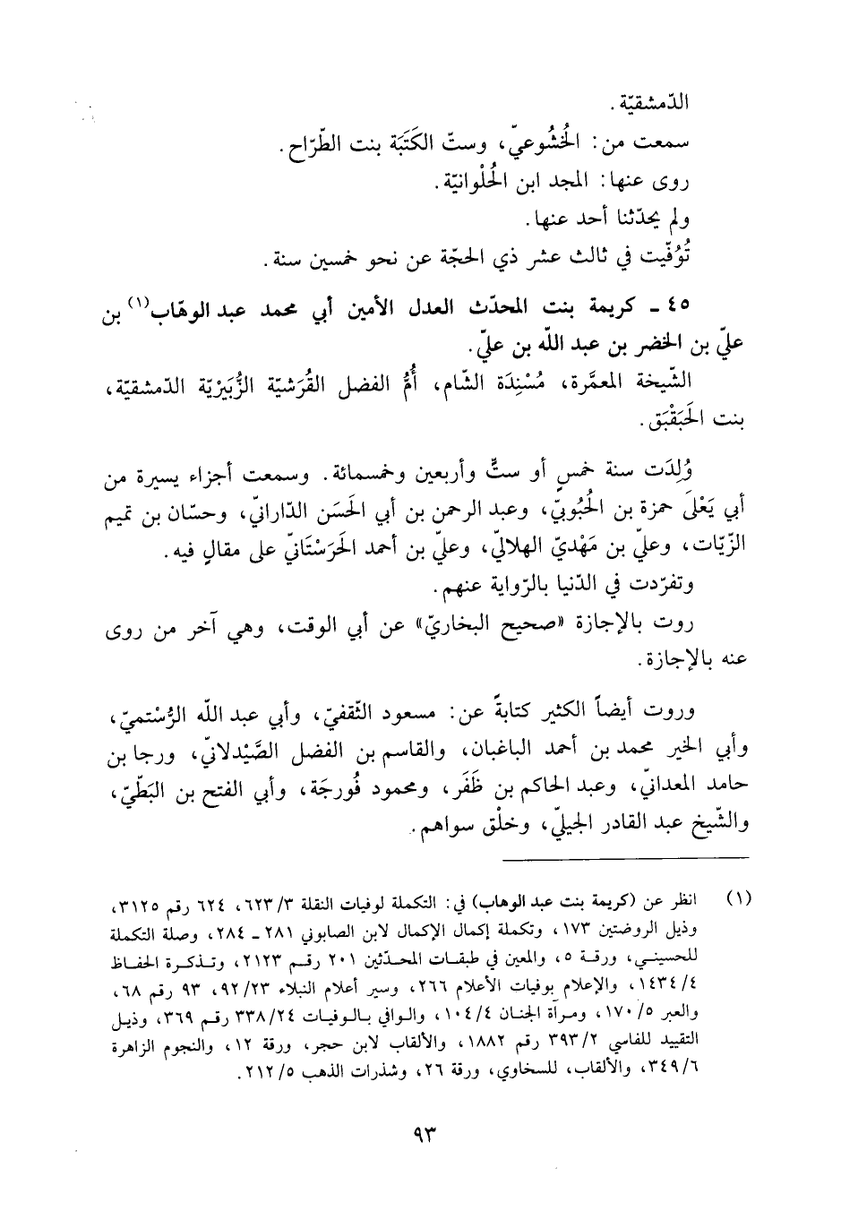 45- كريمة بِنْت المحدّث العدل الأمين أَبِي مُحَمَّد عَبْد الوهَّاب [1] بْن عَليّ بْن الخَضِر بْن عبد الله بن عَلِيّ.
