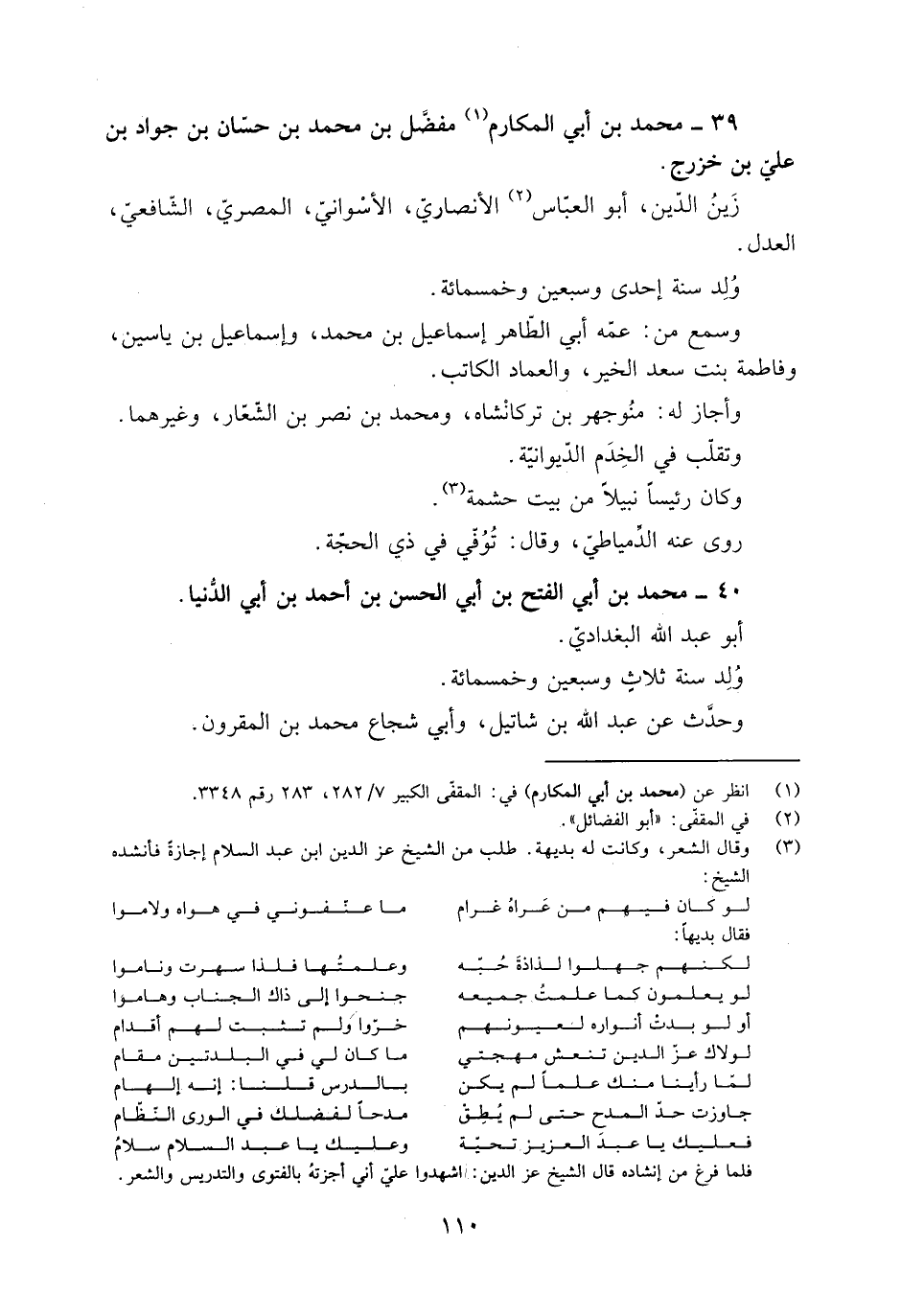 39- مُحَمَّد بن أَبِي المكارم [1] مفضّل بْن مُحَمَّد بْن حسّان بْن جواد بْن عليّ بن خزرج.