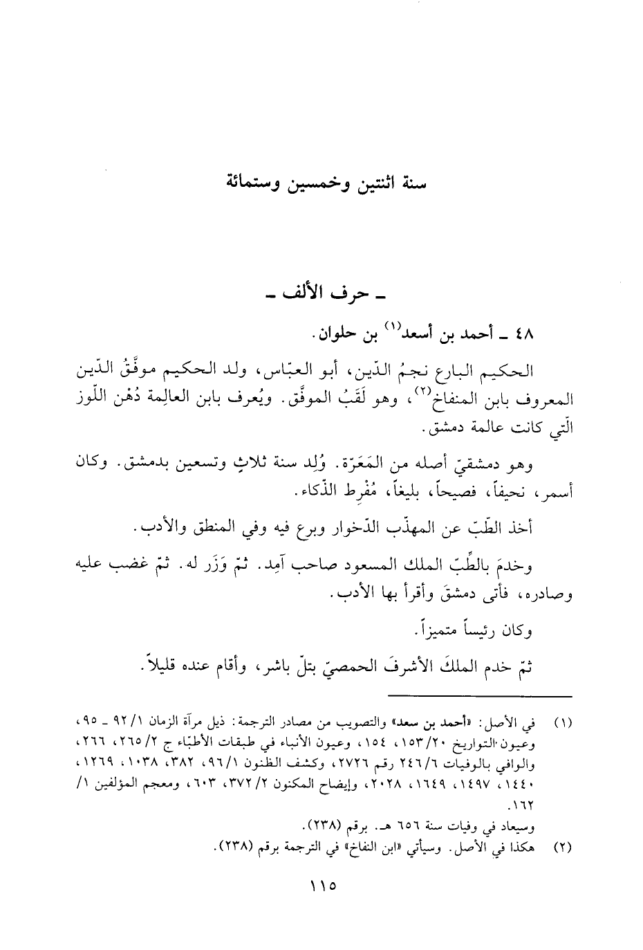 الحكيم البارع نجمُ الدّين، أَبُو الْعَبَّاس، ولد الحكيم موفقُ الدّين المعروف بابن المنفاخ [2] ، وهو لَقَبُ الموفّق. ويُعرف بابن العالِمة دُهْن اللّوز الّتي كانت عالمة دمشق.