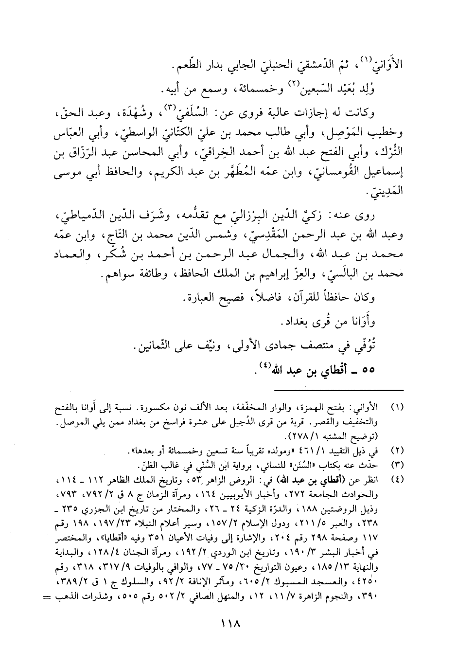 [4] انظر عن (أقطاي بن عبد الله) في: الروض الزاهر 53، وتاريخ الملك الظاهر 112- 114، والحوادث الجامعة 272، وأخبار الأيوبيين 164، ومرآة الزمان ج 8 ق 2/ 792، 793، وذيل الروضتين 188، والدرّة الزكية 24- 26، والمختار من تاريخ ابن الجزري 235- 238، والعبر 5/ 211، ودول الإسلام 2/ 157، وسير أعلام النبلاء 23/ 197، 198 رقم 117 وصفحة 298 رقم 204، والإشارة إلى وفيات الأعيان 351 وفيه «أقطايا» ، والمختصر في أخبار البشر 3/ 190، وتاريخ ابن الوردي 2/ 192، ومرآة الجنان 4/ 128، والبداية والنهاية 13/ 185، وعيون التواريخ 20/ 75- 77، والوافي بالوفيات 9/ 317، 318، رقم 4250، والعسجد المسبوك 2/ 605، ومآثر الإنافة 2/ 92، والسلوك ج 1 ق 2/ 389، 390، والنجوم الزاهرة 7/ 11، 12، والمنهل الصافي 2/ 502 رقم 505، وشذرات الذهب