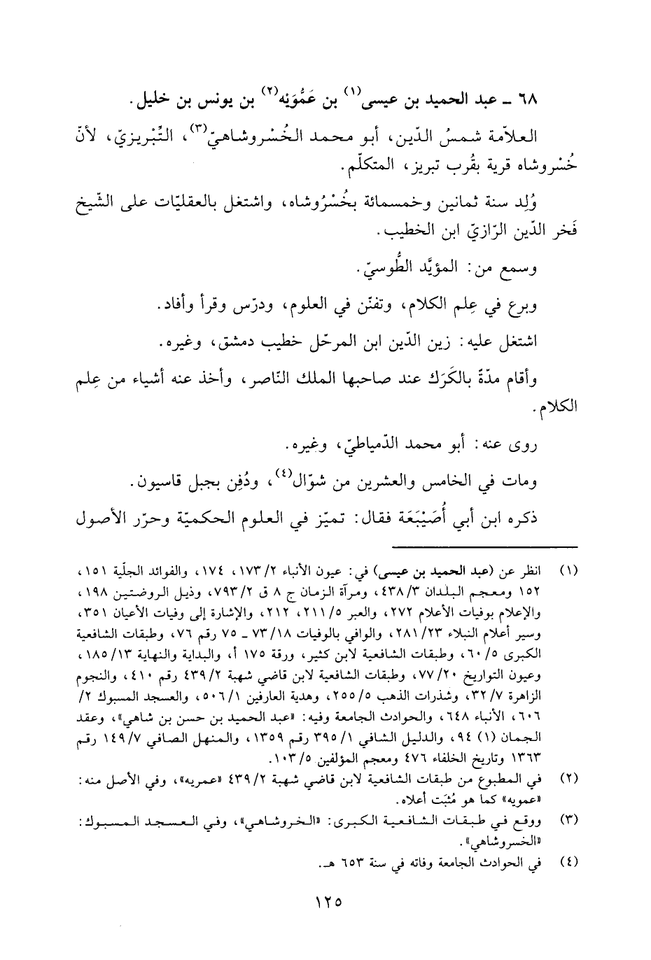 [1] انظر عن (عبد الحميد بن عيسى) في: عيون الأنباء 2/ 173، 174، والفوائد الجليّة 151، 152 ومعجم البلدان 3/ 438، ومرآة الزمان ج 8 ق 2/ 793، وذيل الروضتين 198، والإعلام بوفيات الأعلام 272، والعبر 5/ 211، 212، والإشارة إلى وفيات الأعيان 351، وسير أعلام النبلاء 23/ 281، والوافي بالوفيات 18/ 73- 75 رقم 76، وطبقات الشافعية الكبرى 5/ 60، وطبقات الشافعية لابن كثير، ورقة 175 أ، والبداية والنهاية 13/ 185، وعيون التواريخ 20/ 77، وطبقات الشافعية لابن قاضي شهبة 2/ 439 رقم 410، والنجوم الزاهرة 7/ 32، وشذرات الذهب 5/ 255، وهدية العارفين 1/ 506، والعسجد المسبوك 2/ 606، الأنباء 648، والحوادث الجامعة وفيه: «عبد الحميد بن حسن بن شاهي» ، وعقد الجمان (1) 94، والدليل الشافي 1/ 395 رقم 1359، والمنهل الصافي 7/ 149 رقم 1363 وتاريخ الخلفاء 476 ومعجم المؤلفين 5/ 103.