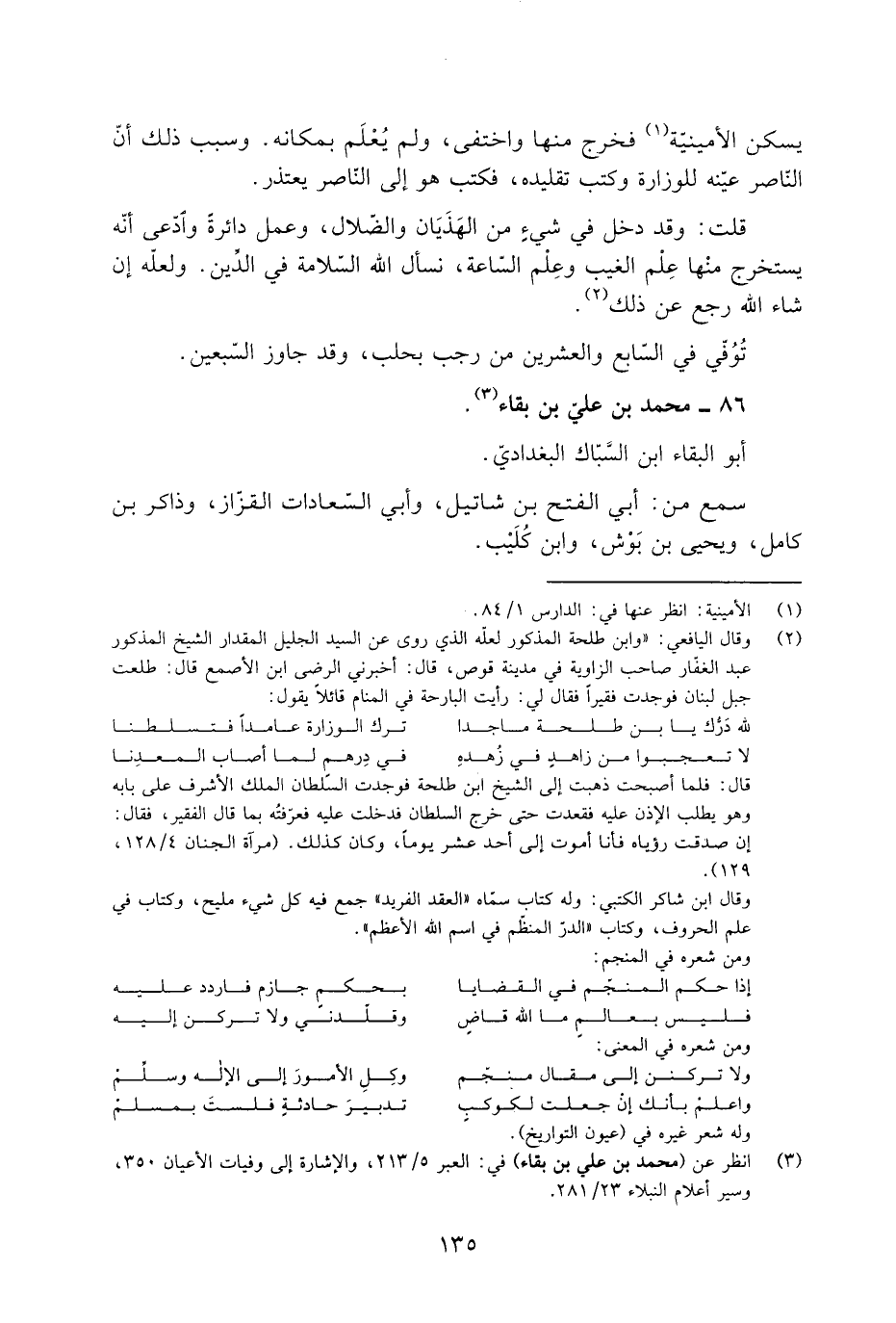 [3] انظر عن (محمد بن علي بن بقاء) في: العبر 5/ 213، والإشارة إلى وفيات الأعيان 350، وسير أعلام النبلاء 23/ 281.