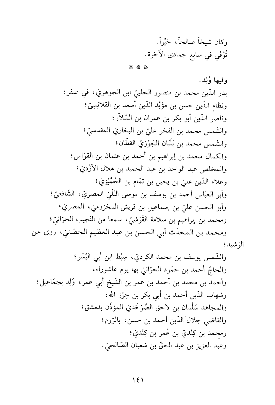 بدر الدّين مُحَمَّد بن منصور الحلبيّ ابن الجوهريّ، فِي صَفَر، ونظام الدّين حَسَن بن مؤيّد الدّين أسعد بن القلانِسِي، وناصر الدّين أَبُو بَكْر بن عمران بن السّلّار، والشّمس مُحَمَّد بن الفخر عليّ بن الْبُخَارِيّ المقدسيّ، والشّمس مُحَمَّد بن بَلَبَان الجوْزي القطّان، والكمال مُحَمَّد بن إِبْرَاهِيم بن أَحْمَد بن عثمان بن القوّاس، والمخلص عَبْد الواحد بن عَبْد الحميد بن هلال الأَزْدِيّ، وعلاء الدّين عليّ بن يحيى بن تمّام بن الْجُميزي، وأبو الْعَبَّاس أَحْمَد بن يوسف بن مُوسَى التّلّيّ المصريّ، الشّافعيّ، وأبو الْحَسَن عليّ بن إِسْمَاعِيل بن قريش المخزوميّ، الْمَصْرِيّ، ومحمد بن إِبْرَاهِيم بن سلامة الْقُرَشِيّ، سمعا من النّجيب الحرّانيّ، ومحمد بن المحدّث أَبِي الْحَسَن بن عَبْد العظيم الحصنيّ، روى عن الرّشيد، والشّمس يوسف بن مُحَمَّد الكرديّ، سِبط ابن أَبِي اليُسر، والحاجّ أَحْمَد بن حمّود الحرّانيّ بها يوم عاشوراء، وأحمد بن مُحَمَّد بن أَحْمَد بن عُمَر بن الشَّيْخ أَبِي عُمَر، وُلِد بجمّاعيل، وشهاب الدّين أَحْمَد بن أَبِي بَكْر بن حِرز الله، والمجاهد سَلمان بن لاحق الصرْخَدي المؤذّن بدمشق، والقاضي جلال الدّين أَحْمَد بن حَسَن، بالرّوم، ومحمد بن كِندي بن عُمر بن كِندي، وعبد العزيز بن عَبْد الحقّ بن شعبان الصّالحيّ.