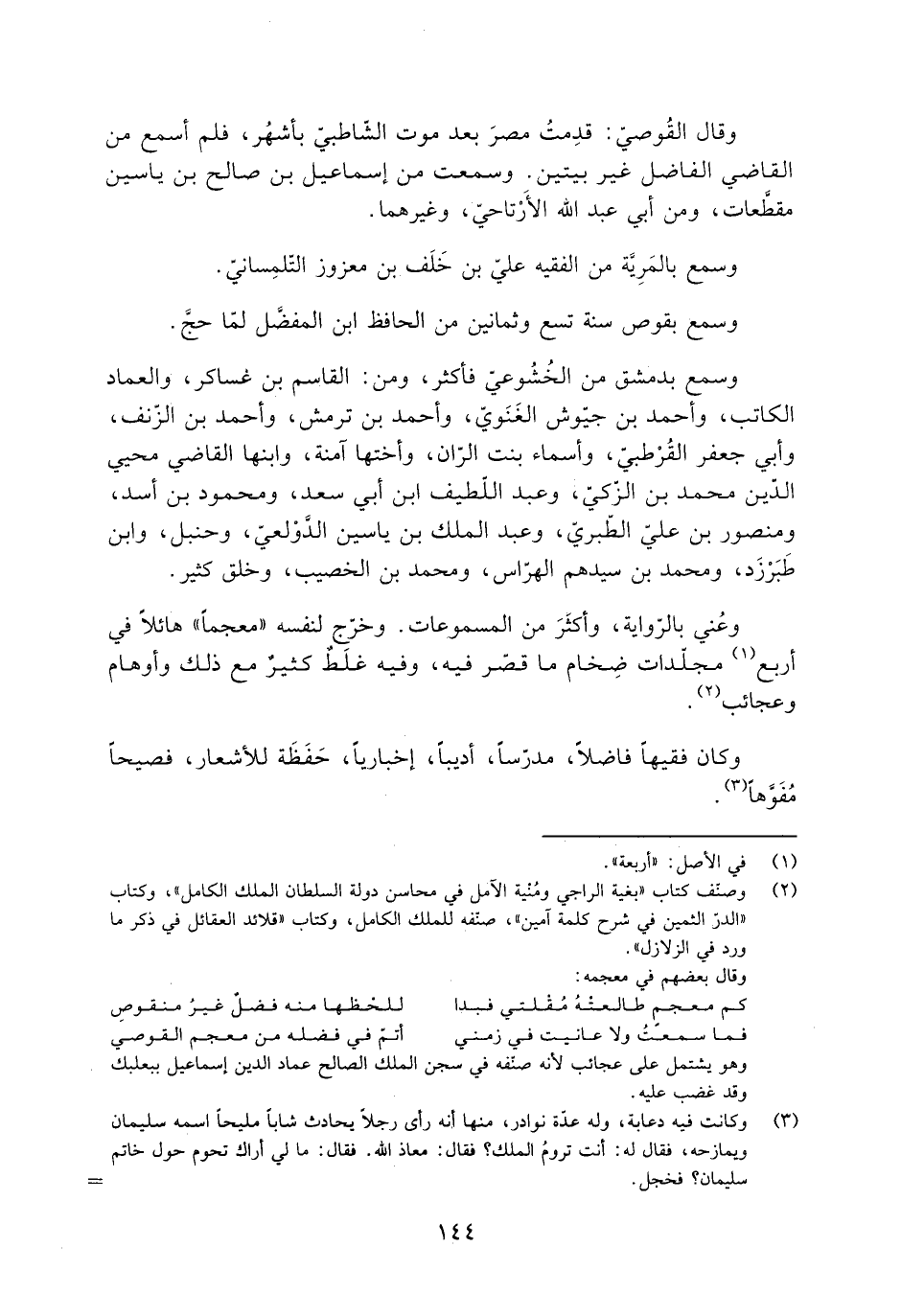 وقال القُوصي: قدِمتُ مصرَ بعد موت الشّاطبيّ بأشهُر، فلم أسمع من القاضي الفاضل غير بيتين. وسمعت من إِسْمَاعِيل بن صالح بن ياسين مقطّعات، ومن أَبِي عَبْد الله الأرتاحيّ، وغيرهما.