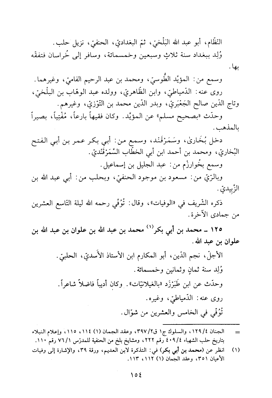 [ () ] الجنان 4/ 129، والسلوك ج 1 ق 2/ 397، وعقد الجمان (1) 114، 115، وإعلام النبلاء بتاريخ حلب الشهباء 4/ 409 رقم 222، ومشايخ بلخ من الحنفية للمدرّس 1/ 76 رقم 110.