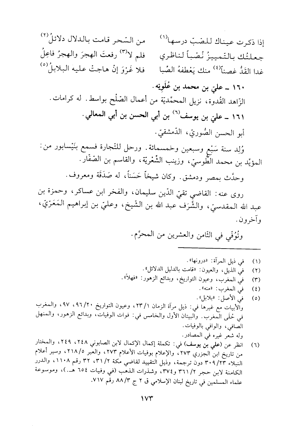[6] انظر عن (علي بن يوسف) في: تكملة إكمال الإكمال لابن الصابوني 248، 249، والمختار من تاريخ ابن الجزري 273، والإعلام بوفيات الأعلام 273، والعبر 5/ 218، وسير أعلام النبلاء 23/ 309 دون ترجمة، وذيل التقييد لقاضي مكة 2/ 31، 32 رقم 1108، والدرر الكامنة لابن حجر 2/ 361 و 374، وشذرات الذهب (في وفيات 654 هـ.) ، وموسوعة علماء المسلمين في تاريخ لبنان الإسلامي ق 2 ج 3/ 88 رقم 717.