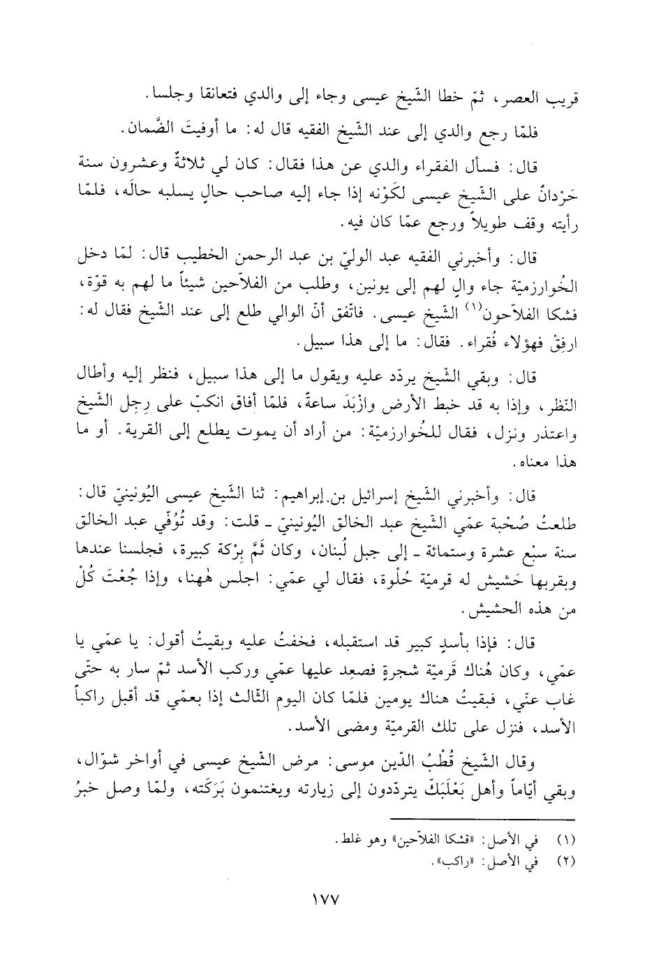 قال: وأخبرني الفقيه عَبْد الوليّ بن عَبْد الرَّحْمَن الخطيب قال: لمّا دخل الخُوارزمية جاء والٍ لهم إلى يونين، وطلب من الفلّاحين شيئا ما لهم به قوّة، فشكا الفلّاحون [1] الشَّيْخ عيسى. فاتّفق أنّ الوالي طلع إلى عند الشَّيْخ فقال له: