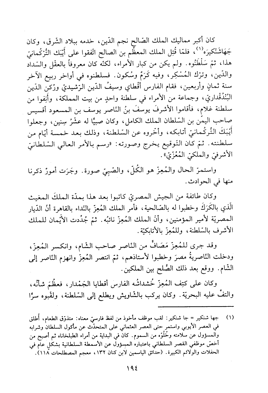 [1] جهاشنكير جاشنكير: لقب موظف مأخوذ من لفظ فارسيّ معناه: متذوّق الطعام، أطلق في العصر الأيوبي واستمر حتى العصر العثماني على المتحدّث عن مأكول السلطان وشرابه والمسئول عن سلامته وخلوّه من السموم. كان في البداية من أمراء الطبلخانات ثم أصبح من أخصّ موظفي القصر السلطاني باعتباره المسئول عن الأسمطة السلطانية بشكل عام في الحفلات والولائم الكبيرة. (حدائق الياسمين لابن كنان 132، معجم المصطلحات 118) .