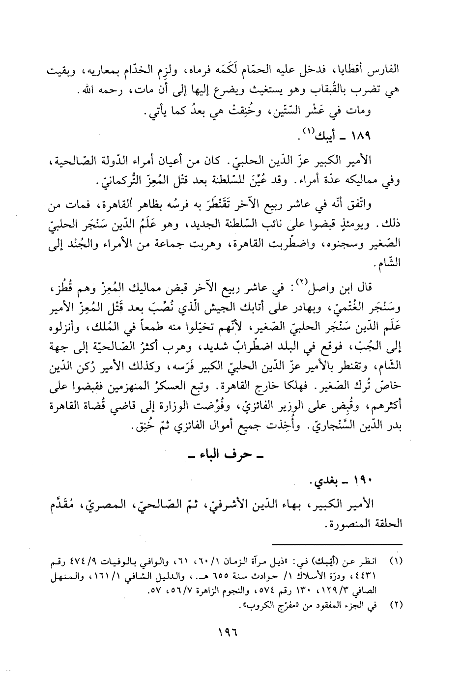 [1] انظر عن (أيبك) في: «ذيل مرآة الزمان 1/ 60، 61، والوافي بالوفيات 9/ 474 رقم 4431، ودرّة الأسلاك 1/ حوادث سنة 655 هـ. والدليل الشافي 1/ 161، والمنهل الصافي 3/ 129، 130 رقم 574، والنجوم الزاهرة 7/ 56، 57.