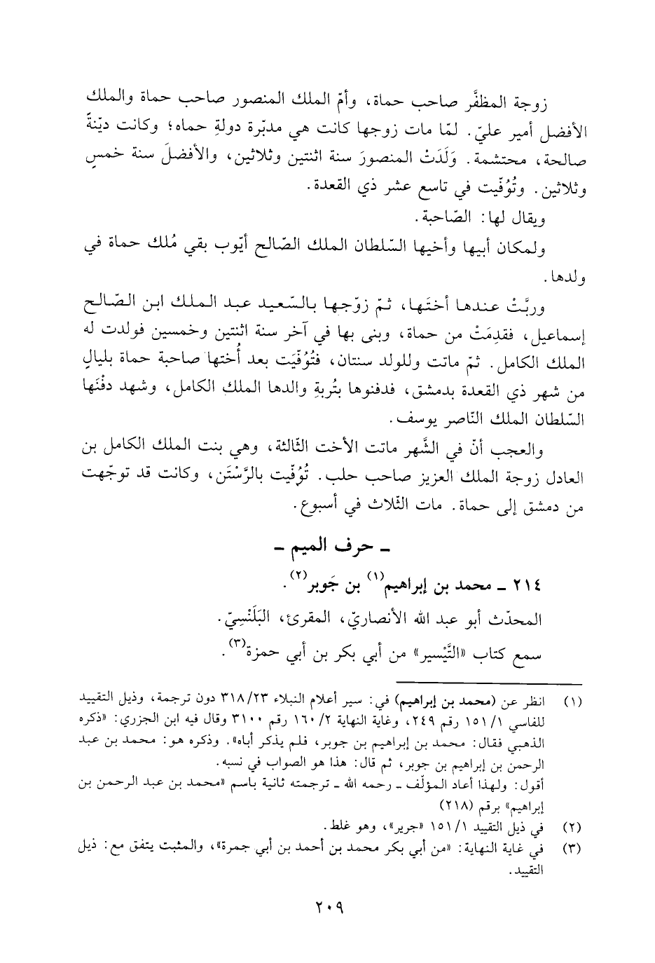 [1] انظر عن (محمد بن إبراهيم) في: سير أعلام النبلاء 23/ 318 دون ترجمة، وذيل التقييد للفاسي 1/ 151 رقم 249، وغاية النهاية 2/ 160 رقم 3100 وقال فيه ابن الجزري: «ذكره الذهبي فقال: محمد بن إبراهيم بن جوبر، فلم يذكر أباه» . وذكره هو: محمد بْن عبد الرحمن بْن إبراهيم بْن جوبر، ثم قال: هذا هو الصواب في نسبه.