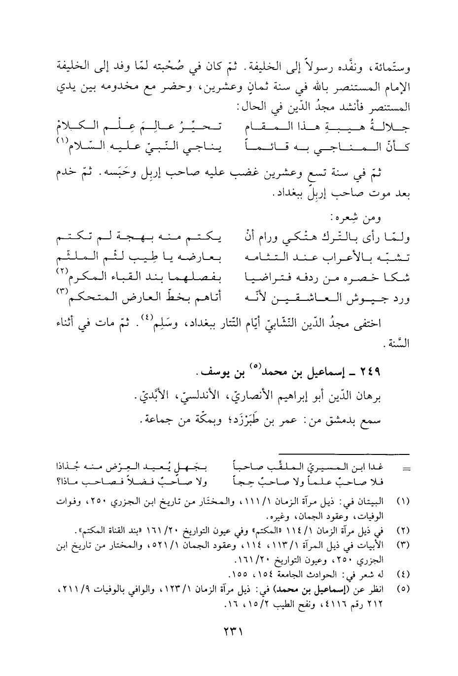 [5] انظر عن (إسماعيل بن محمد) في: ذيل مرآة الزمان 1/ 123، والوافي بالوفيات 9/ 211، 212 رقم 4116، ونفح الطيب 2/ 15، 16.