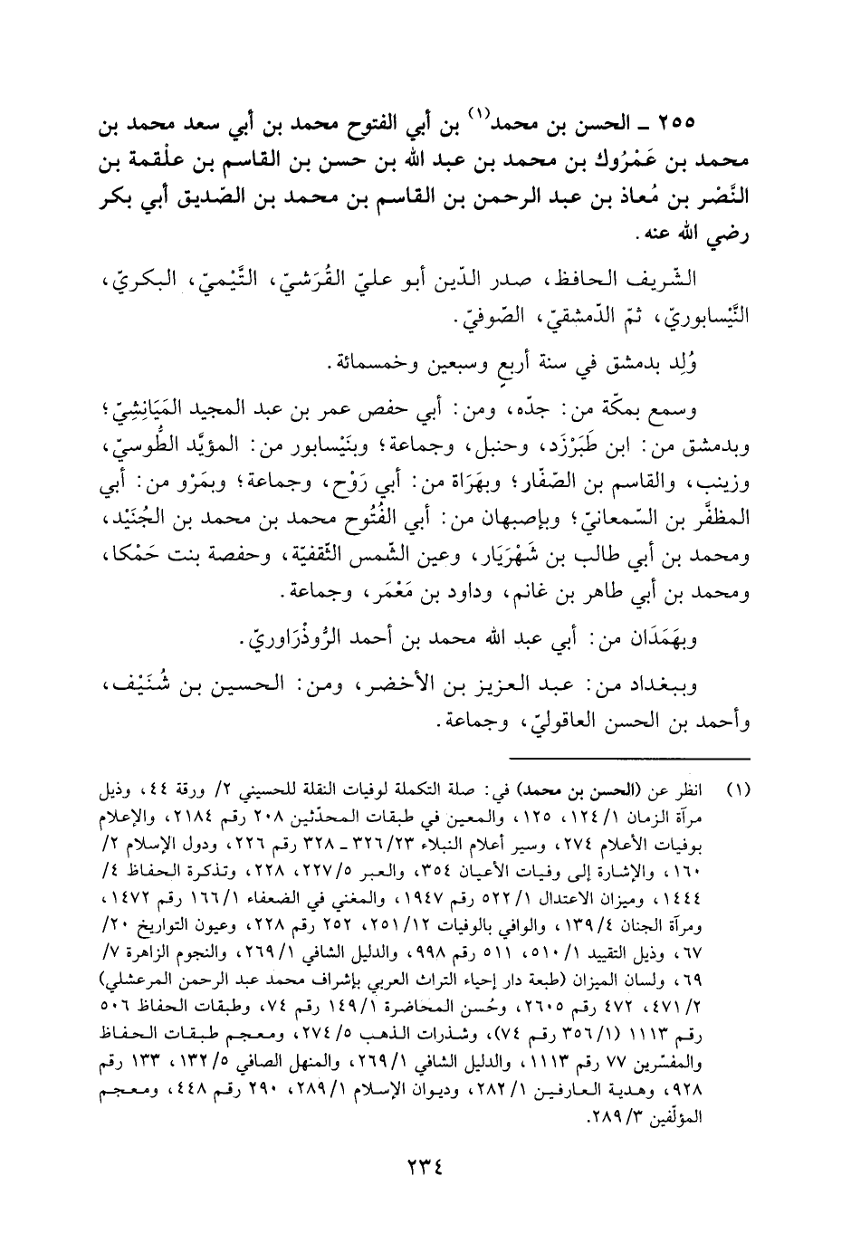 [1] انظر عن (الحسن بن محمد) في: صلة التكملة لوفيات النقلة للحسيني 2/ ورقة 44، وذيل مرآة الزمان 1/ 124، 125، والمعين في طبقات المحدّثين 208 رقم 2184، والإعلام بوفيات الأعلام 274، وسير أعلام النبلاء 23/ 326- 328 رقم 226، ودول الإسلام 2/ 160، والإشارة إلى وفيات الأعيان 354، والعبر 5/ 227، 228، وتذكرة الحفاظ 4/ 1444، وميزان الاعتدال 1/ 522 رقم 1947، والمغني في الضعفاء 1/ 166 رقم 1472، ومرآة الجنان 4/ 139، والوافي بالوفيات 12/ 251، 252 رقم 228، وعيون التواريخ 20/ 67، وذيل التقييد 1/ 510، 511 رقم 998، والدليل الشافي 1/ 269، والنجوم الزاهرة 7/ 69، ولسان الميزان (طبعة دار إحياء التراث العربيّ بإشراف محمد عبد الرحمن المرعشلي) 2/ 471، 472 رقم 2605، وحسن المحاضرة 1/ 149 رقم 74، وطبقات الحفاظ 506 رقم 1113 (1/ 356 رقم 74) ، وشذرات الذهب 5/ 274، ومعجم طبقات الحفاظ والمفسّرين 77 رقم 1113، والدليل الشافي 1/ 269، والمنهل الصافي 5/ 132، 133 رقم 928، وهدية العارفين 1/ 282، وديوان الإسلام 1/ 289، 290 رقم 448، ومعجم المؤلّفين 3/ 289.